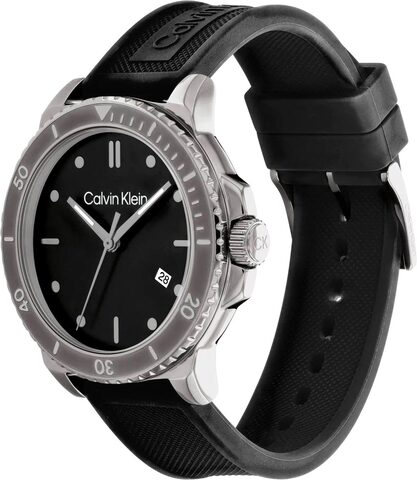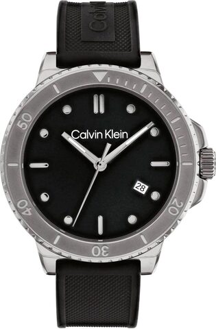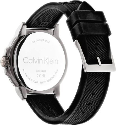 Эти практичные часы с простым и элегантным циферблатом станут отличным спутником в повседневной жизни. Модель выполнена в формате наручных кварцевых часов. Круглый стальной корпус придаёт часам солидность и прочность. Циферблат украшен логотипом бренда Calvin Klein, что добавляет изделию особый шарм. Часовые метки выполнены в виде штрихов и точек, обеспечивая лёгкость чтения времени. В положении 4 часов расположено окошко для отображения даты. Заводная головка, снабжённая защитой, также украшена логотипом ''ck'', подчёркивая премиальность модели. Завершает образ удобный каучуковый ремешок с классической застёжкой, который обеспечивает комфортное ношение.