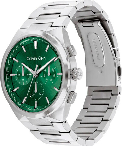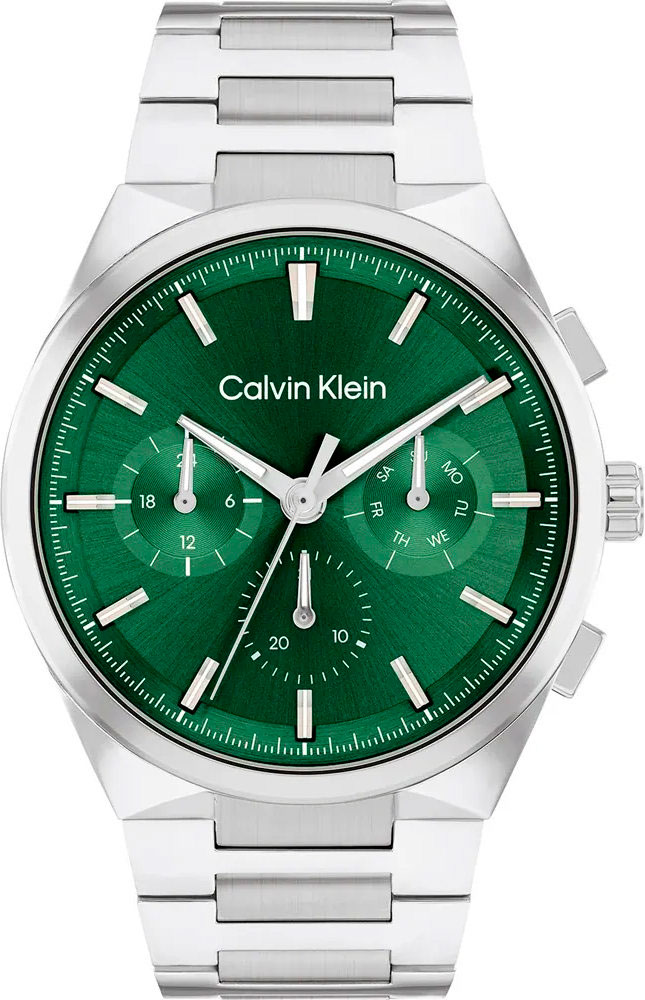 Элегантный минимализм этого аксессуара станет идеальным дополнением к вашему повседневному стилю. Мужские часы оснащены круглым стальным корпусом. Они поддерживают как 12-часовой, так и 24-часовой формат времени. Информация о дате и дне недели отображается на отдельных циферблатах. Циферблат украшен метками в виде штрихов. Заводная головка имеет рифленую поверхность. Стальной браслет дополнен раскладывающейся застежкой.
