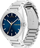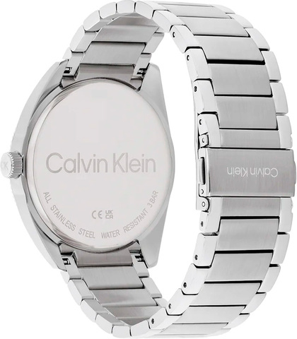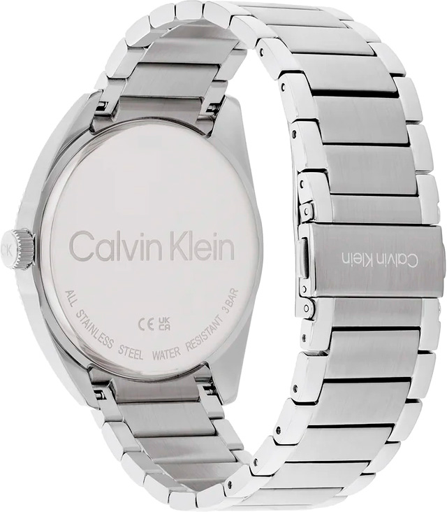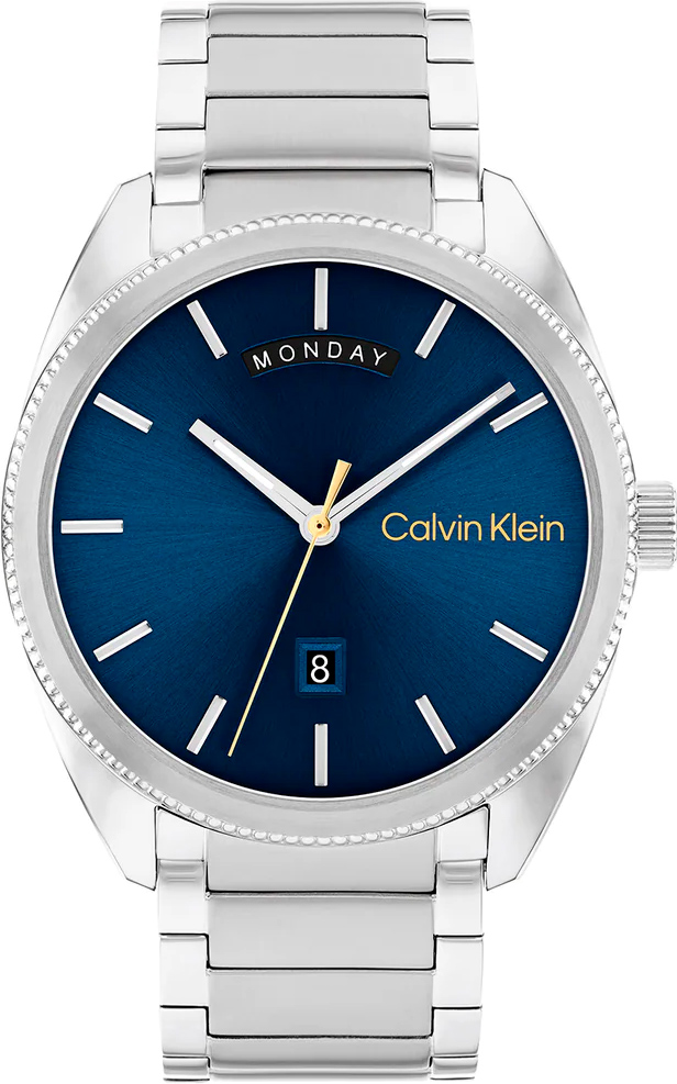 Эти стильные и практичные часы идеально подчёркивают индивидуальность, статус и безупречный вкус своего обладателя. Мужские кварцевые часы. Корпус выполнен в форме круга из нержавеющей стали. Безель украшен рифлёным узором. Циферблат с эффектом солнечных лучей, украшен фирменным знаком Calvin Klein в положении «3 часа» и защищён минеральным стеклом. Часовые метки выполнены в виде штрихов. Индикатор даты расположен в положении «6 часов», а индикатор дня недели — в положении «12 часов». Рифлёная заводная головка декорирована логотипом «CK». Браслет из стали с раскладывающейся застёжкой и двумя кнопками, также украшен логотипом бренда Calvin Klein.