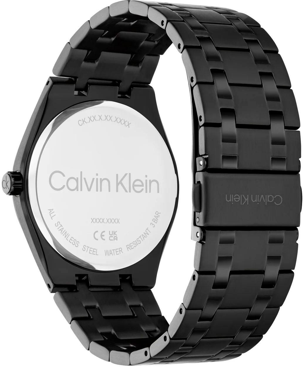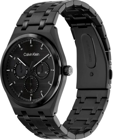 Мужские кварцевые часы с функционалом. Корпус из стали, круглый, с матовой и блестящей поверхностью. Циферблат украшен узором из тонких горизонтальных линий, выполненным по технологии Sunray (солнечные лучи), и фирменным логотипом Calvin Klein.