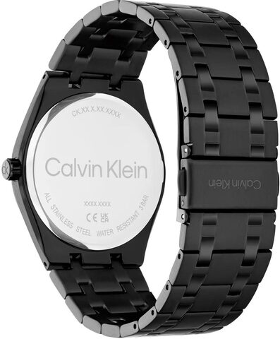 Дата и день недели отображаются на отдельных циферблатах. Доступны 12-часовой и 24-часовой форматы времени. Рифленая заводная головка декорирована логотипом CK. Браслет из стали с матовой и глянцевой отделкой.