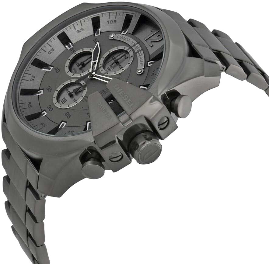 Mega Chief Chronograph — это хронограф с секундомером. Корпус изготовлен из стали и имеет круглую форму. На циферблате расположены метки в виде штрихов и арабская цифра 12. Индикатор даты находится на отметке 3 часа. Заводная головка рифленая и защищена. Задняя крышка завинчивается. Браслет оснащен раскладывающейся застежкой.