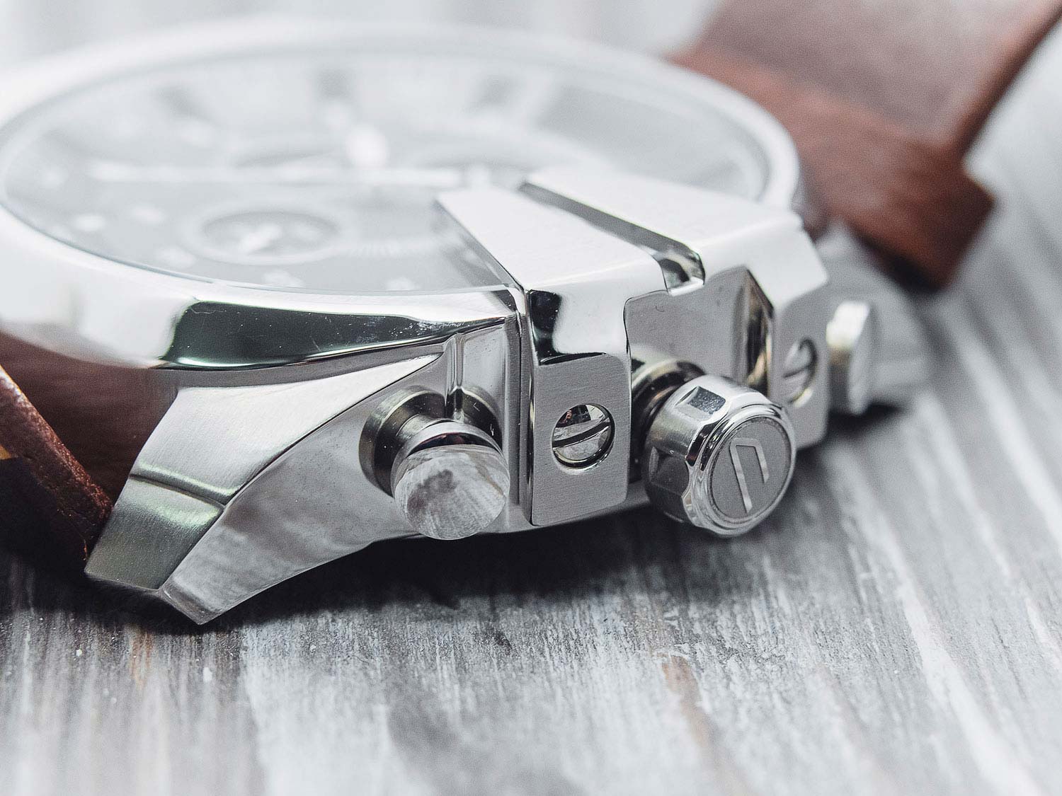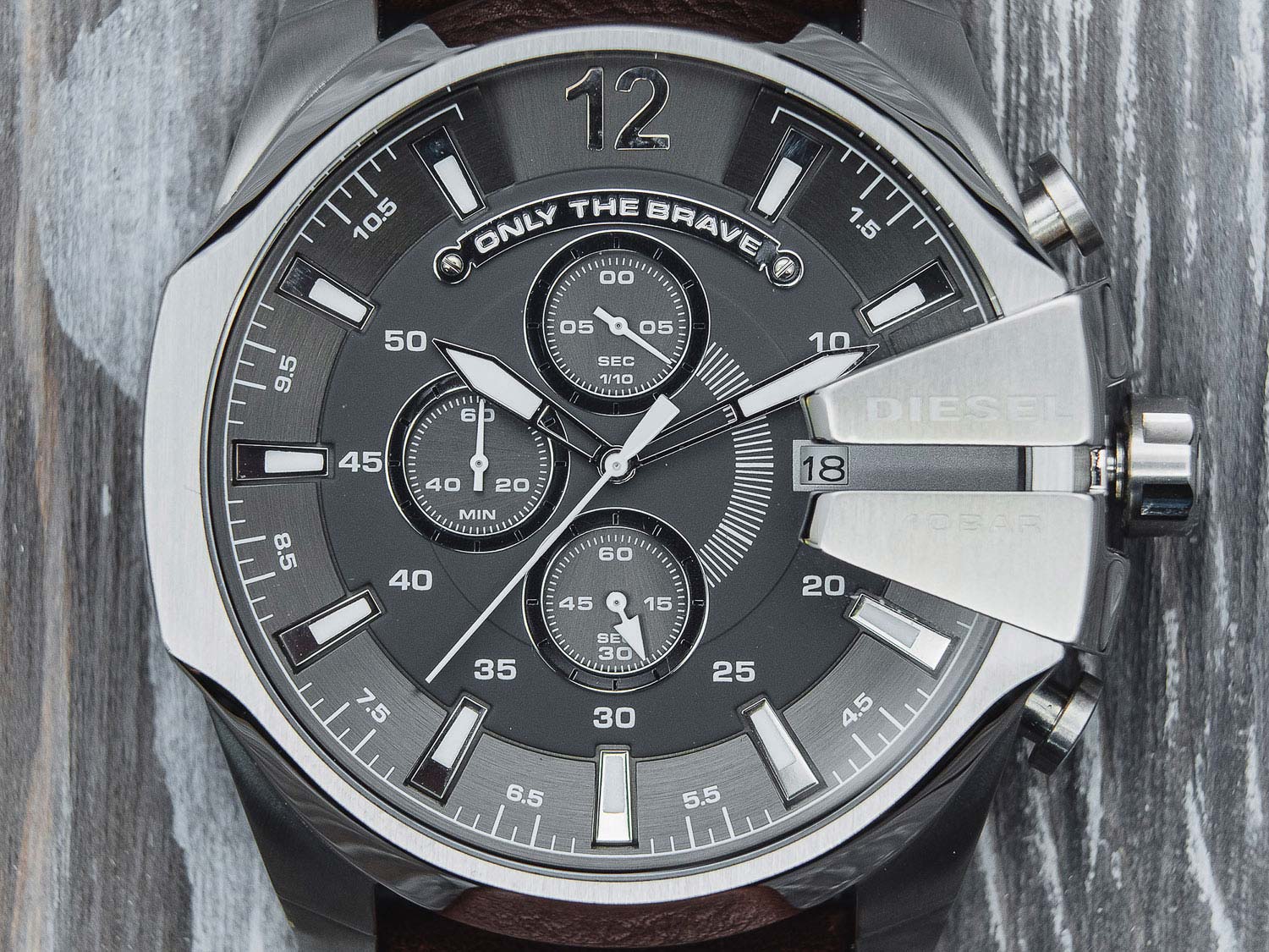 Mega Chief Chronograph — это хронограф с секундомером. Корпус выполнен из стали круглой формы. Часовые метки представляют собой штрихи и арабскую цифру 12. Индикатор даты расположен на отметке 3 часа. Заводная головка рифленая и защищена. Задняя крышка завинчивающаяся. Ремешок из кожи с классической застежкой.