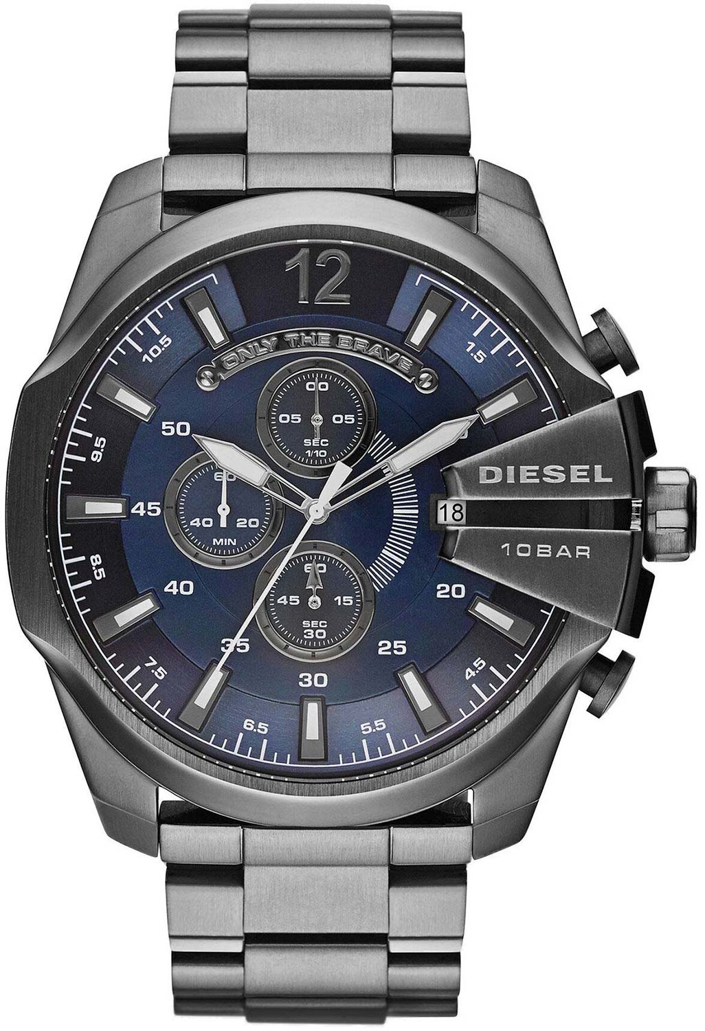 Mega Chief Chronograph — это хронограф с секундомером, выполненный в круглом стальном корпусе. Циферблат украшен штриховыми метками и арабской цифрой 12. Окно даты расположено в положении 3 часов. Заводная головка имеет рифленую поверхность и защиту. Задняя крышка завинчивается, обеспечивая дополнительную герметичность. Браслет оснащен раскладывающейся застежкой.