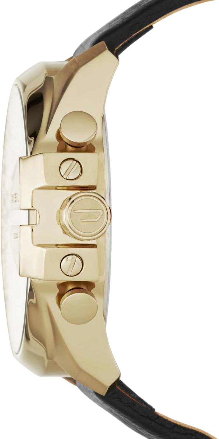 Солидный корпус, функциональность и уникальный дизайн ''Diesel'' — этот аксессуар непременно привлечет к вам внимание. Модель Mega Chief Chronograph представляет собой часы-хронограф с секундомером. Они имеют круглый стальной корпус. Метки выполнены в виде штрихов и арабской цифры 12. Индикатор даты расположен в положении 3 часа. Заводная головка рифленая и снабжена защитой. Задняя крышка завинчивается. Ремешок из кожи оснащен классической застежкой.