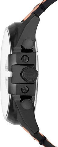 Mega Chief. Хронограф с секундомером. Круглый корпус из стали. Метка 12 выполнена в виде штриха, остальные — арабские цифры. Дата отображается в положении 3 часов. Заводная головка рифленая и защищена. Задняя крышка завинчивающаяся. Ремешок из кожи.