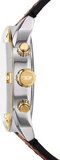 Мужские часы с хронографом и секундомером. Корпус круглой формы изготовлен из нержавеющей стали и украшен декоративными винтами. Циферблат имеет эффект солнечных лучей (технология Sunray). Метки представлены арабскими цифрами и штрихами. Индикатор даты расположен в положении 4 часов. Заводная головка рифленая. Ремешок из кожи с классической застежкой.