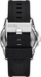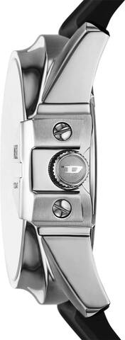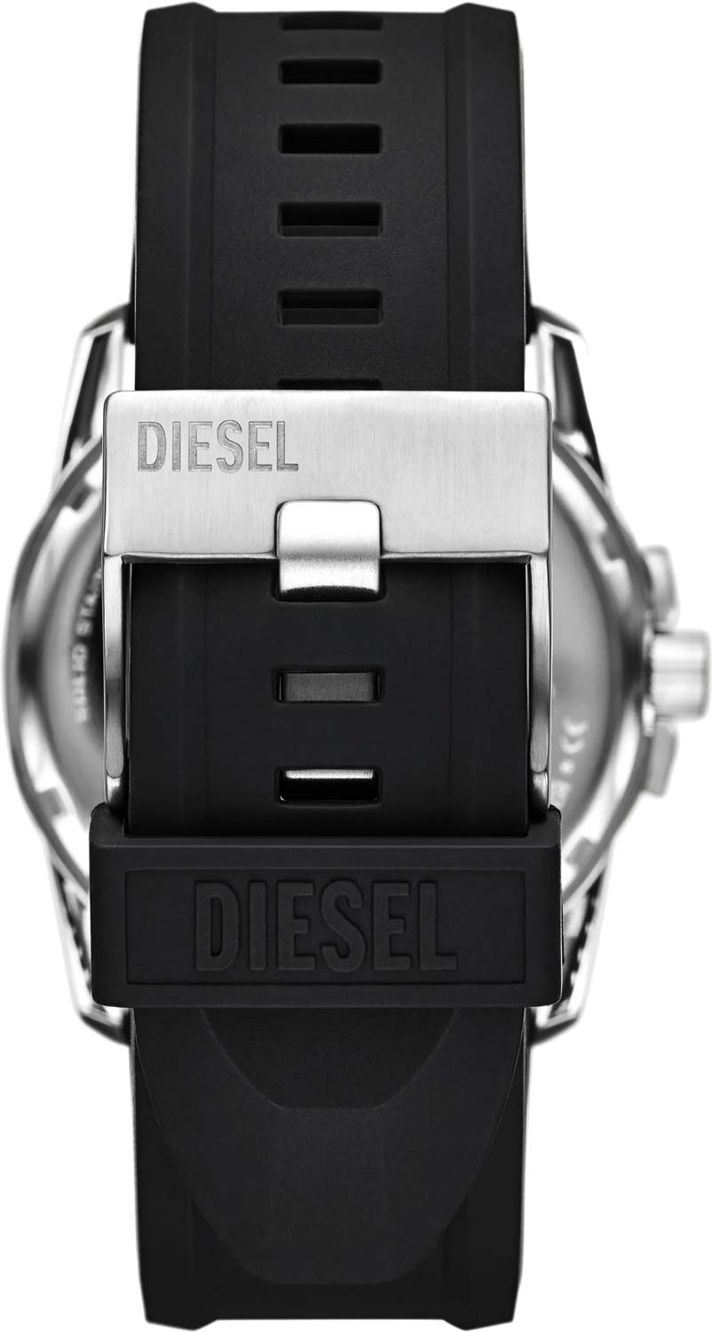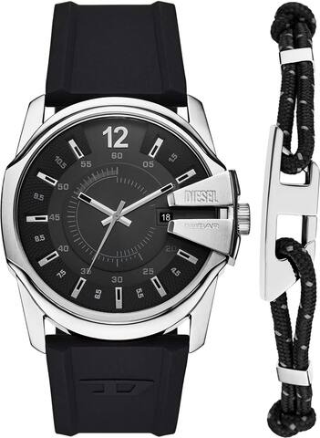 Master Chief. Циферблат с метками в виде штрихов и арабской цифры, обозначающей 12 часов. Окошко даты расположено на отметке в три часа. Рифленая заводная головка снабжена защитой. Ремешок из силикона с классической застежкой. В комплекте также есть ремешок с логотипом Diesel, который можно носить на запястье.