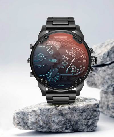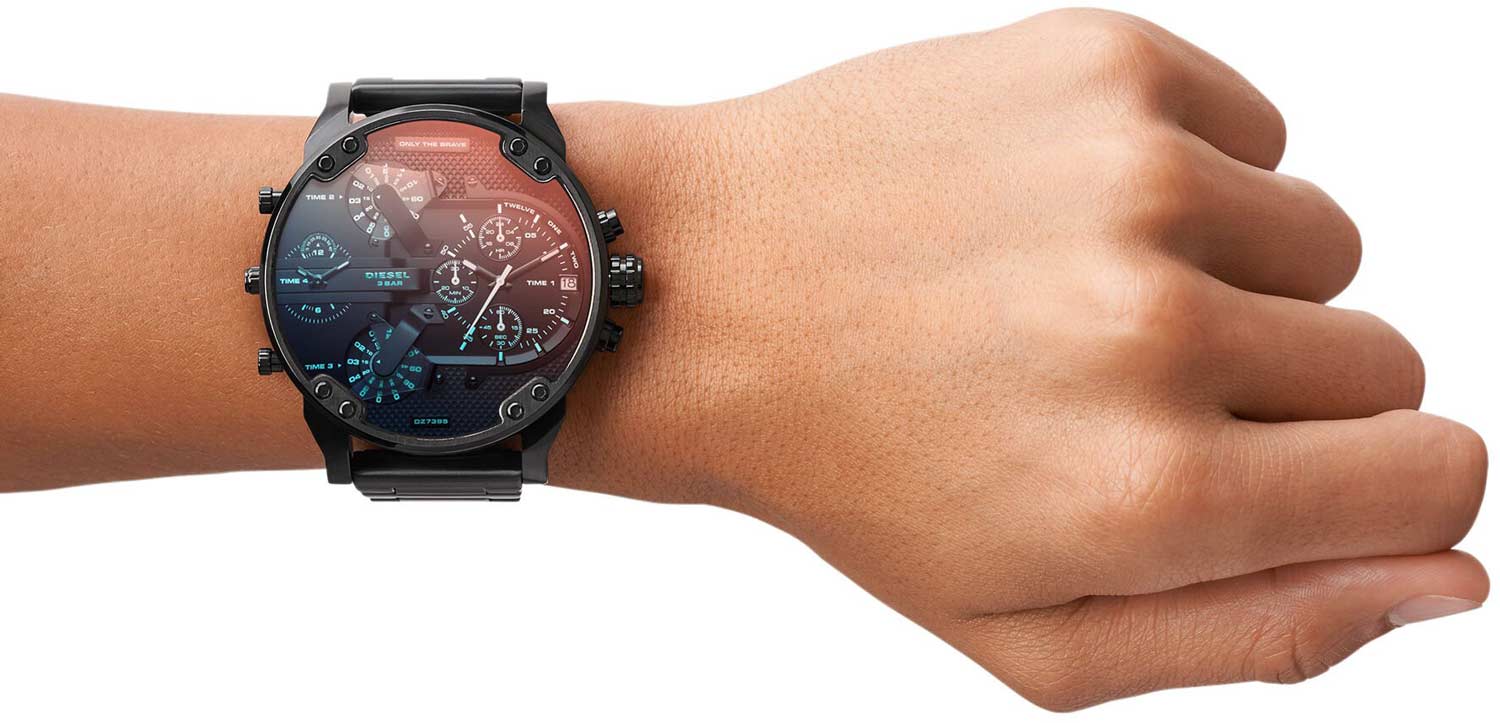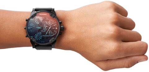 На двух дополнительных циферблатах расположены указатели часов и минут в виде вращающихся дисков, а на третьем — указатель секунд, который также вращается. Браслет оснащён раскладывающейся застёжкой.