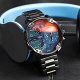 Мужские часы с хронографом и секундомером. Корпус выполнен из стали, украшен матовыми и полированными элементами. Внутри четыре механизма. Есть возможность отображать время в четырёх часовых поясах. На основном циферблате видны штриховые метки, минутная шкала и счётчики на 60 секунд и 30 минут. Также присутствуют 12-часовой и 24-часовой форматы времени, а в положении 3 часов расположено окошко для даты.