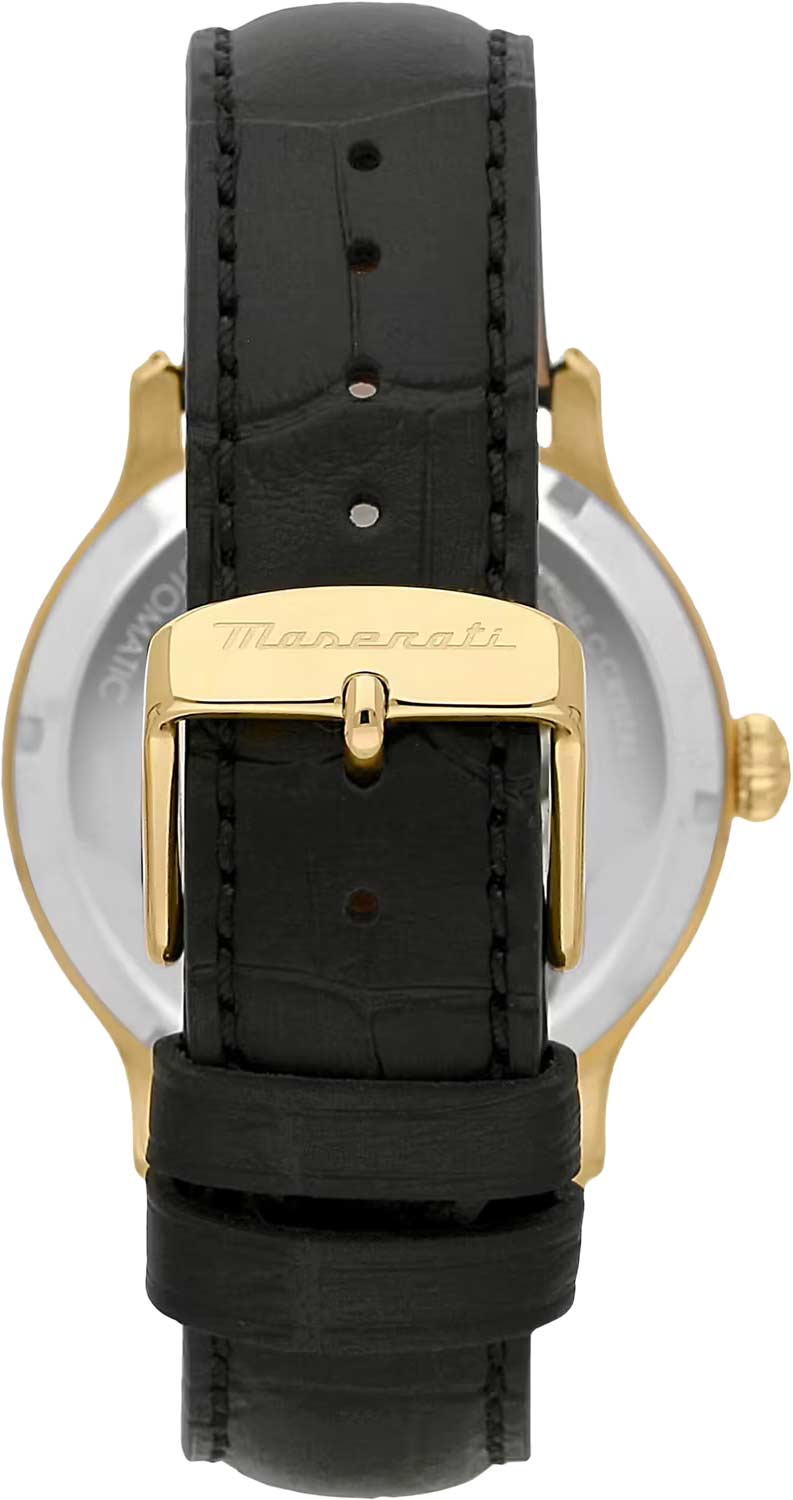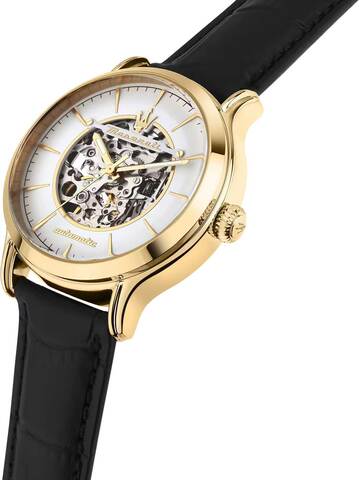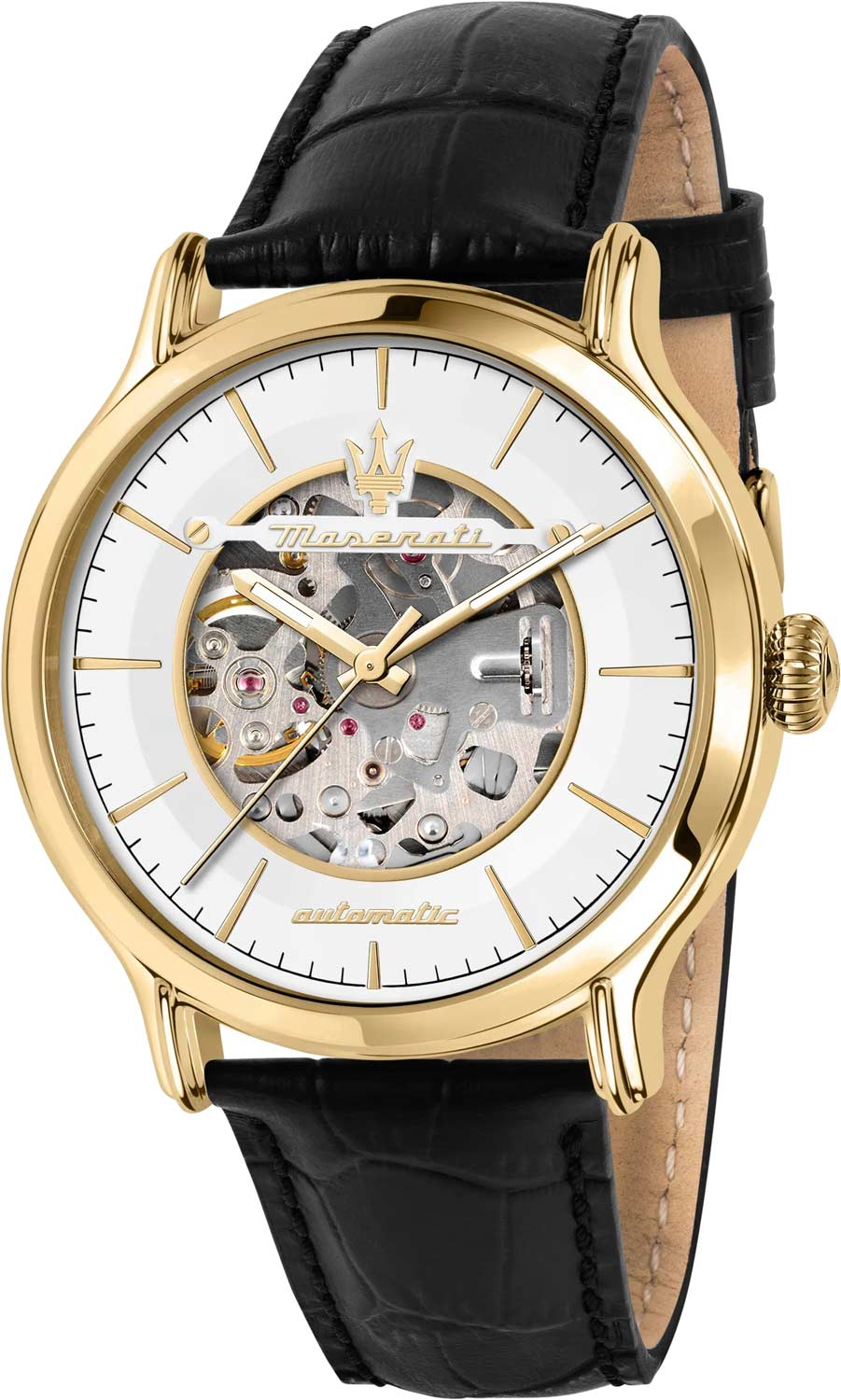 Мужские наручные часы в скелетонизированном дизайне. Круглый корпус из стали. Циферблат украшен фирменным логотипом Maserati, метки выполнены в виде штрихов.