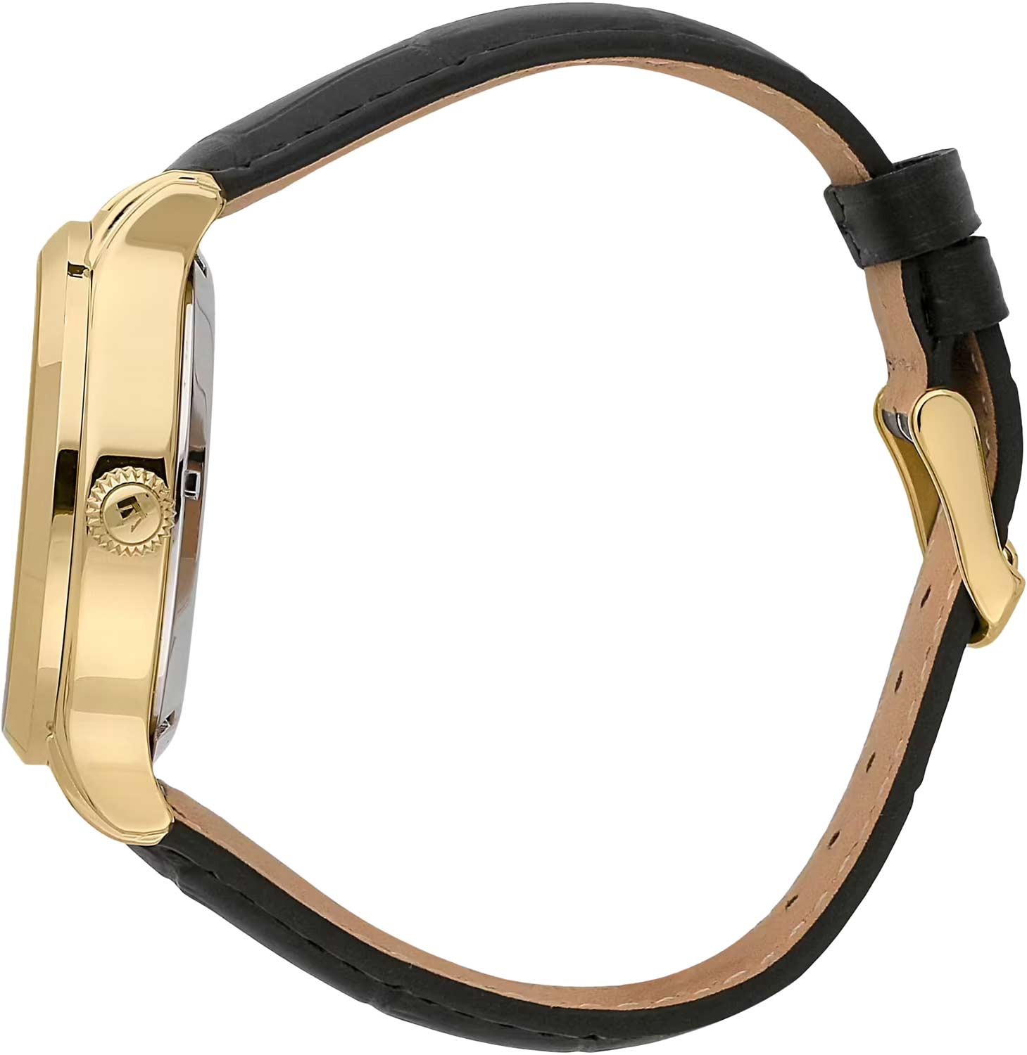 Заводная головка с рифлёной поверхностью. Прозрачная задняя крышка с завинчивающейся конструкцией. Ремешок из кожи с классической застежкой.