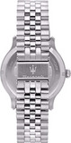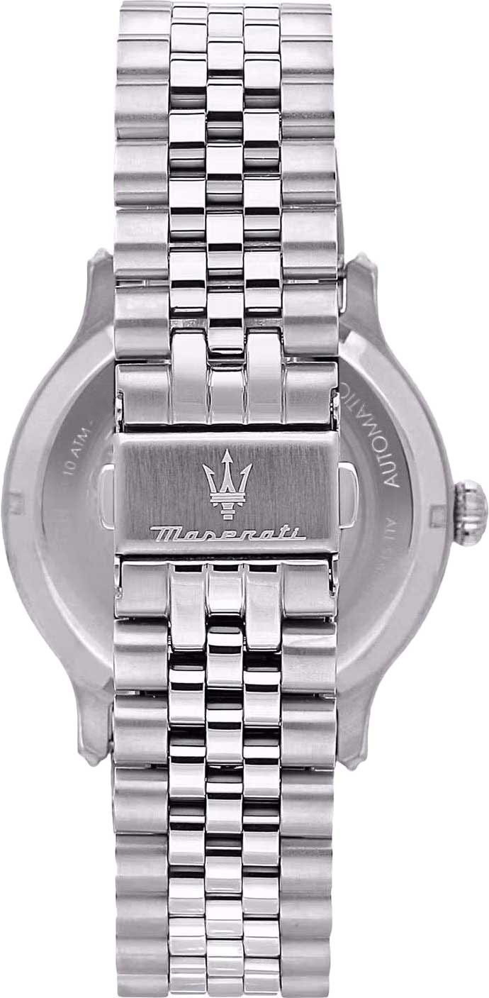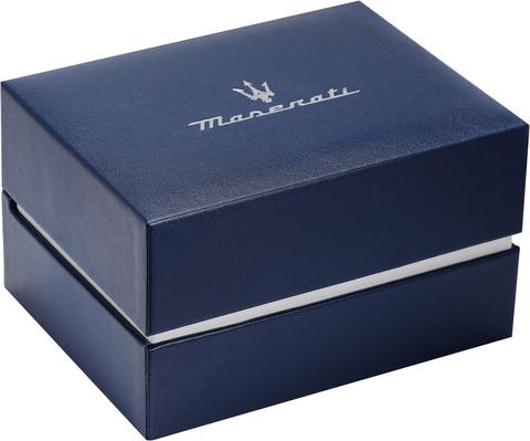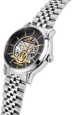 Скелетонизированные часы оснащены механизмом с 21 камнем и частотой 21600 полуколебаний в час, обеспечивая запас хода до 42 часов и возможность ручного завода. В часах предусмотрена функция stop-second. Циферблат украшен фирменным логотипом «Maserati» и имеет метки в виде штрихов. Заводная головка и задняя крышка выполнены с завинчивающимися элементами. Браслет оснащен раскладывающейся застежкой.