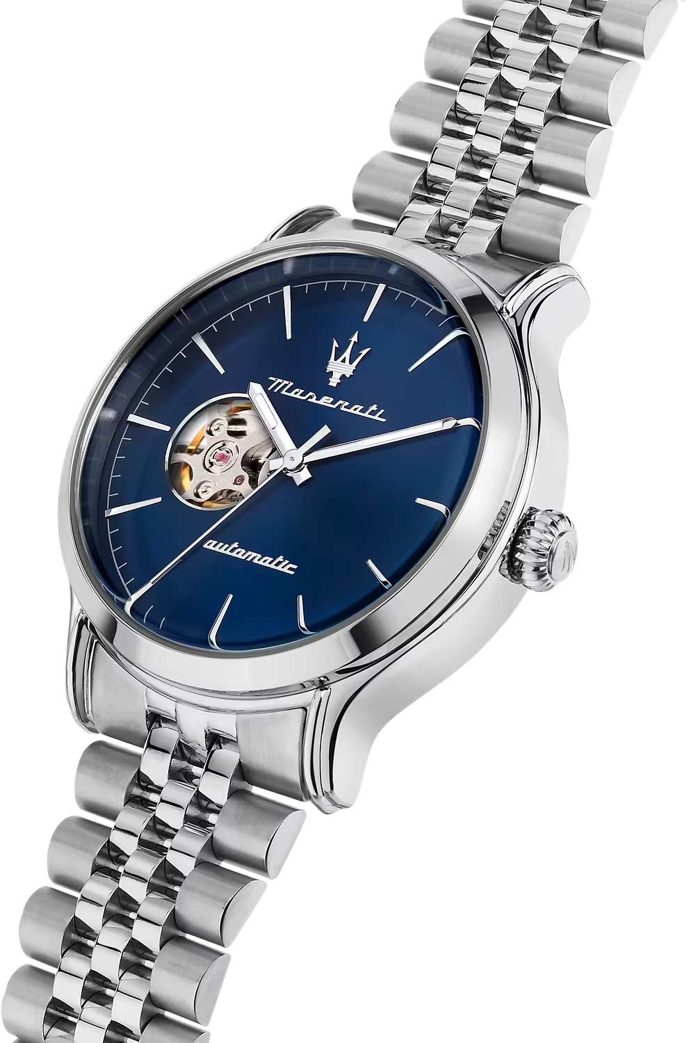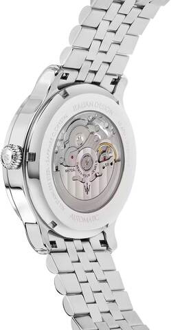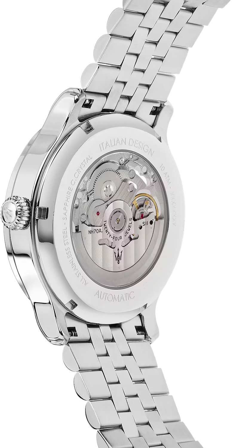 Через прозрачное окошко на циферблате можно увидеть работу часового механизма. Заводная головка рифленая. Задняя крышка завинчивающаяся, прозрачная. Браслет оснащен раскладывающейся застежкой.
