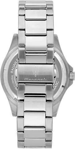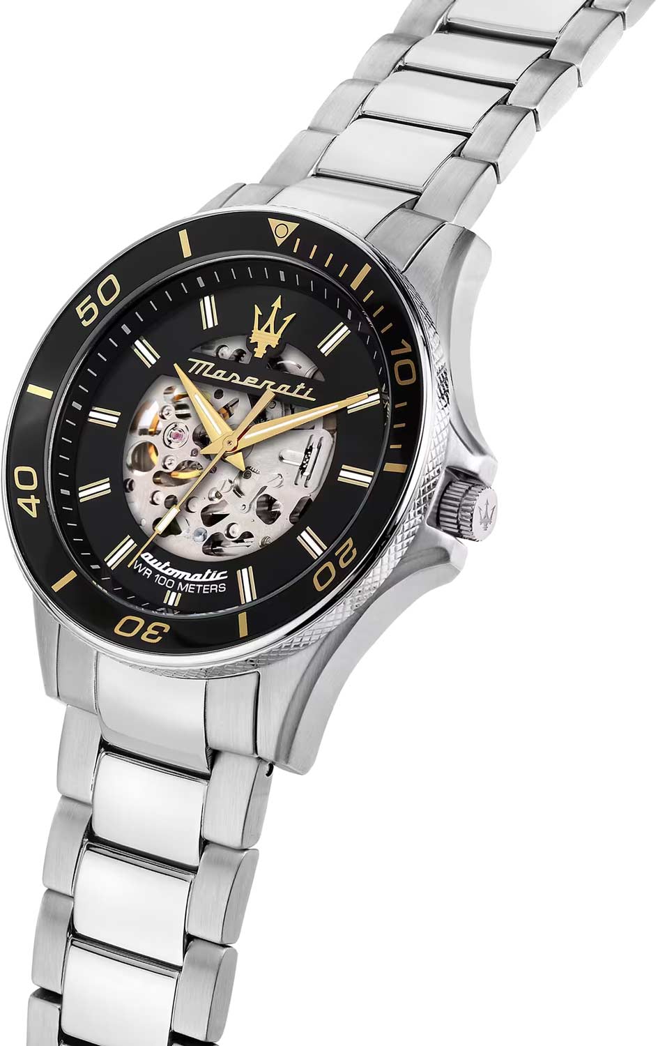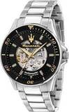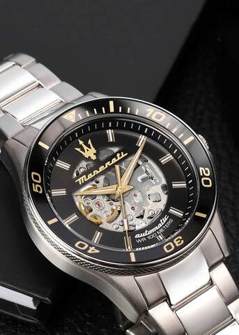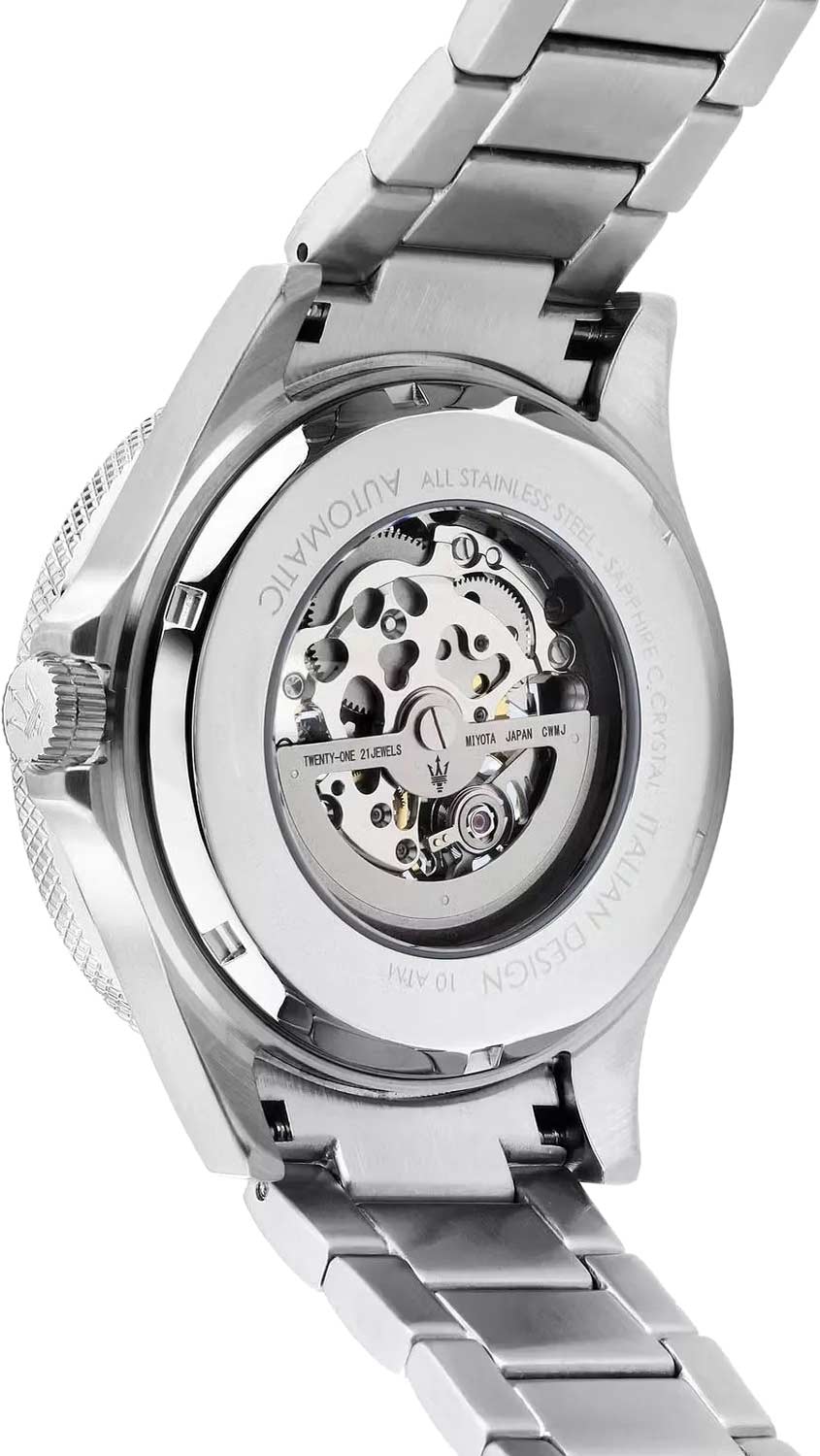 Мужские наручные часы скелетонизированного типа. Механизм содержит 21 драгоценный камень. Круглый корпус из стали. Безель с минутной разметкой. Циферблат, созданный по технологии Sunray (эффект солнечных лучей), украшен логотипом бренда ''Maserati''.