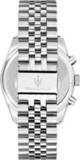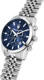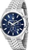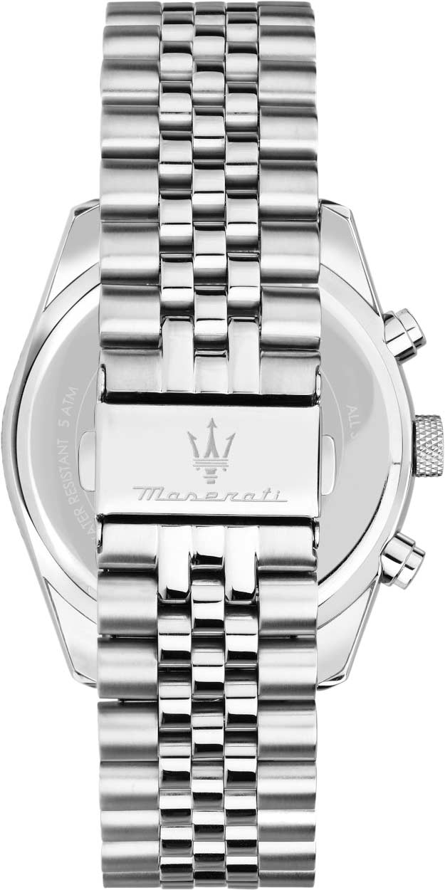 Мужские часы-хронограф с секундомером оснащены 12-часовым и 24-часовым форматом времени. Корпус выполнен из стали и имеет круглую форму. Циферблат изготовлен по технологии Sunray (солнечные лучи) и украшен логотипом бренда Maserati. Часовые метки представлены в виде штрихов.
