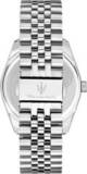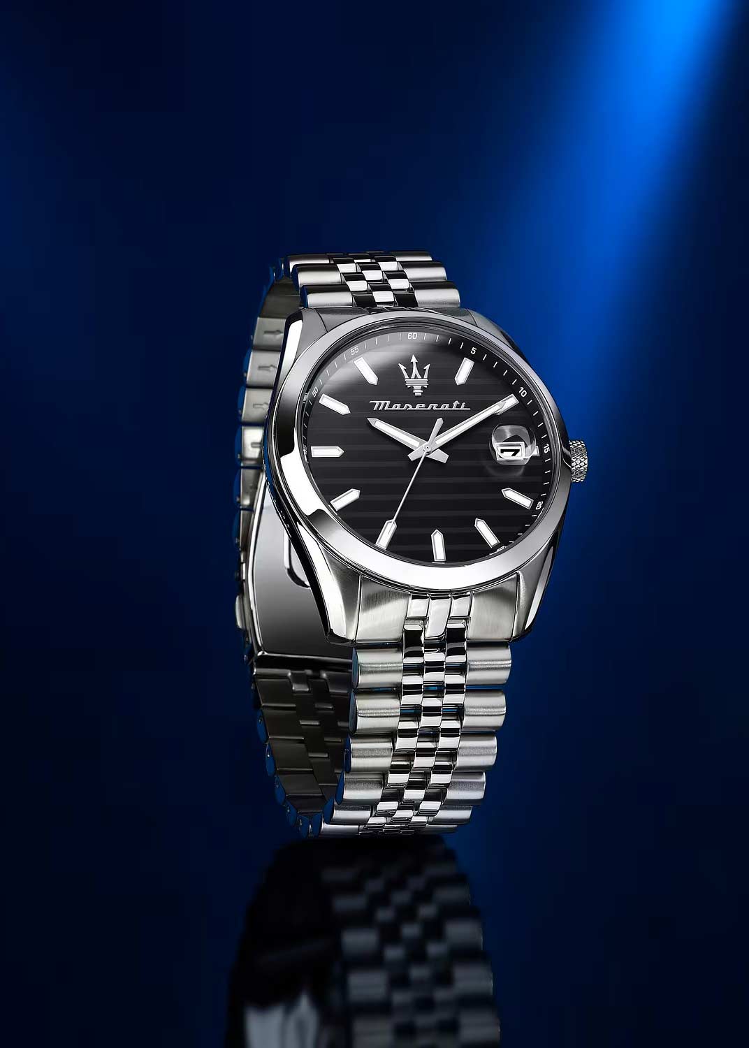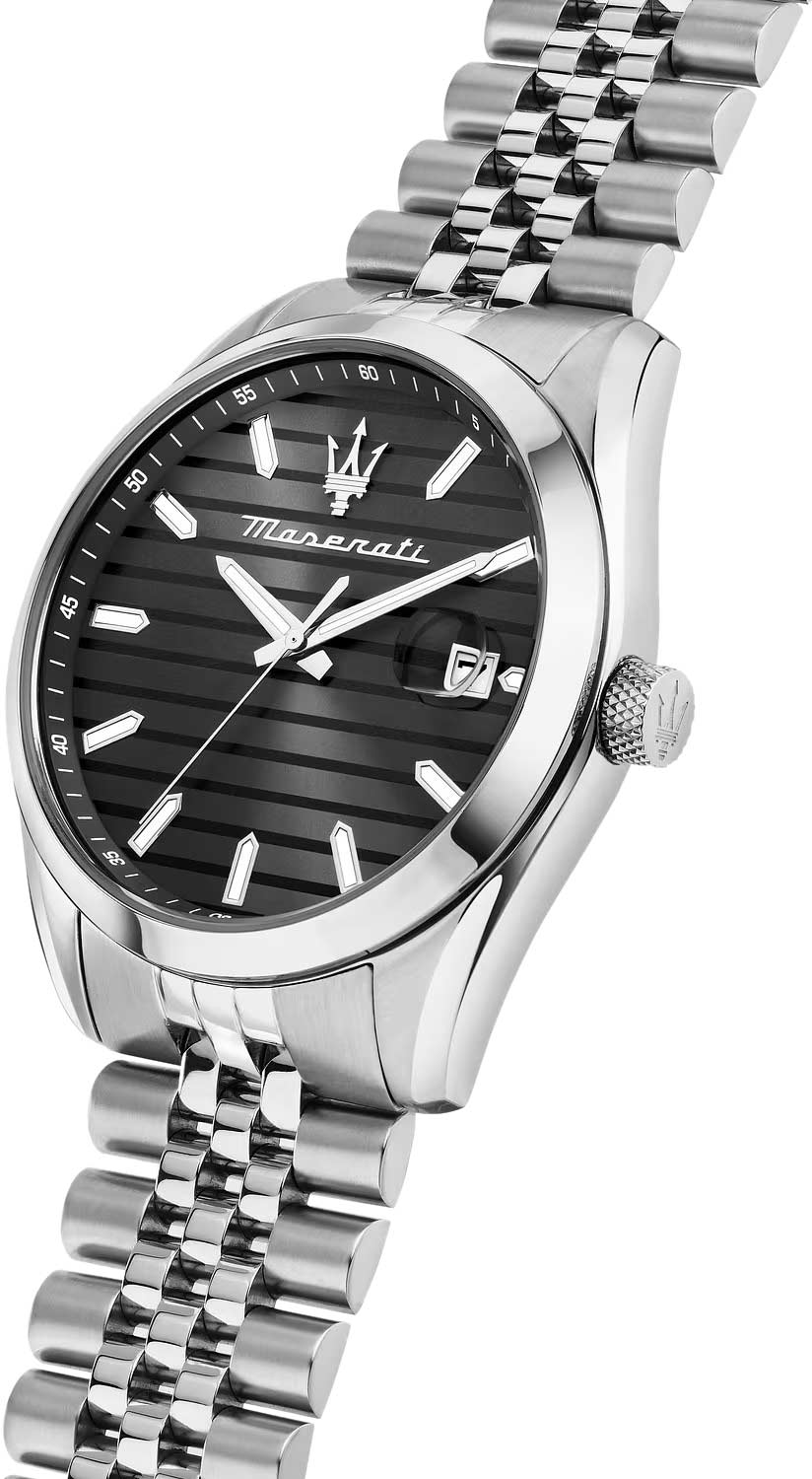 Мужские наручные часы. Круглый стальной корпус. Циферблат с рисунком в полоску выполнен по технологии Sunray (солнечные лучи) и украшен фирменным логотипом ''Maserati''. Метки в виде штрихов.