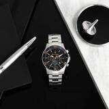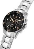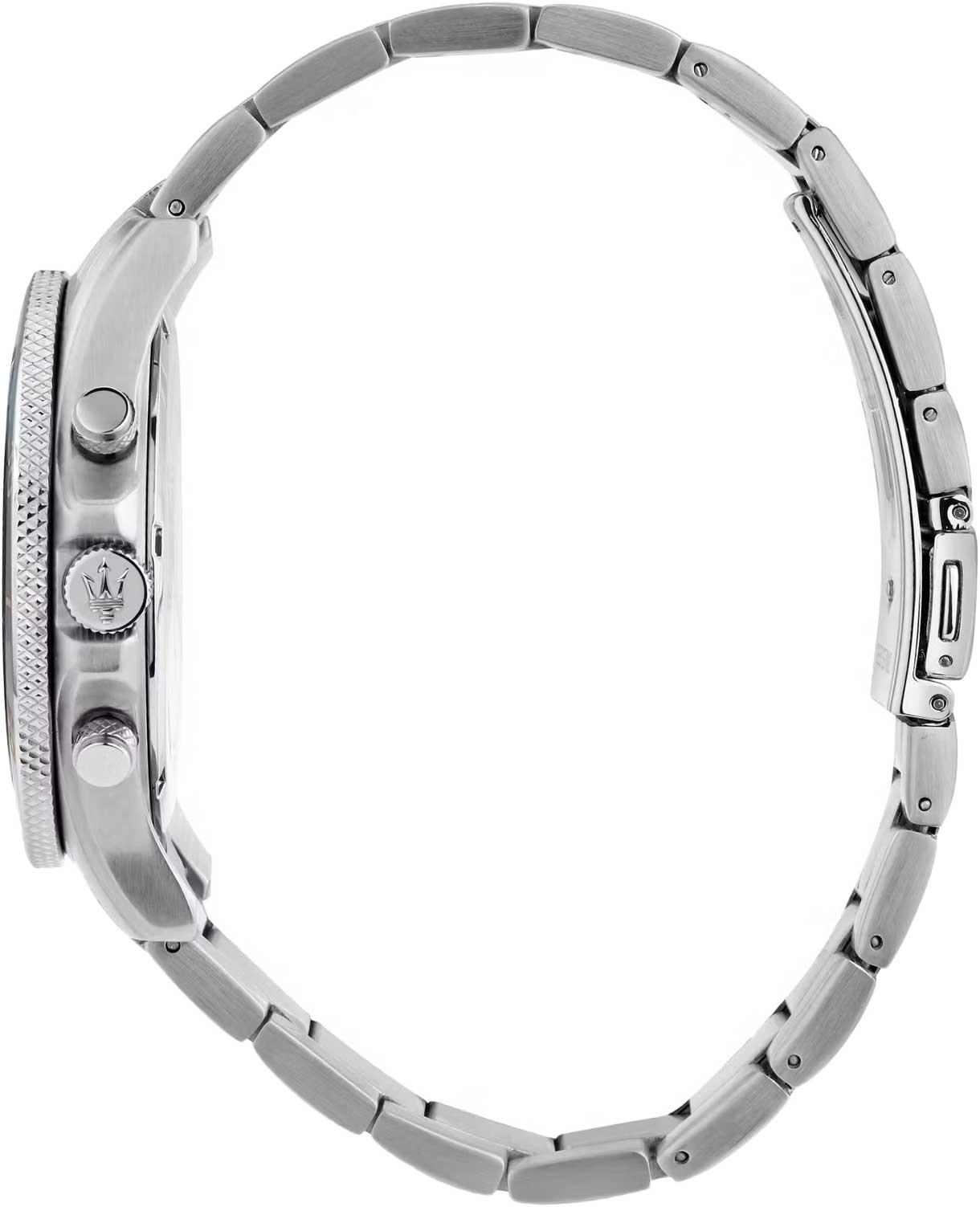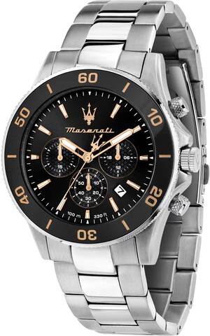 Хронограф с секундомером. Время отображается в 12-часовом и 24-часовом форматах. Циферблат изготовлен по технологии Sunray (солнечные лучи) и украшен логотипом «Maserati». Часовые метки выполнены в виде штрихов. Окошко даты расположено между отметками 4 и 5 часов. Безель имеет керамическую вставку. Задняя крышка завинчивающаяся, заводная головка защищена. Браслет с раскладывающейся застёжкой.