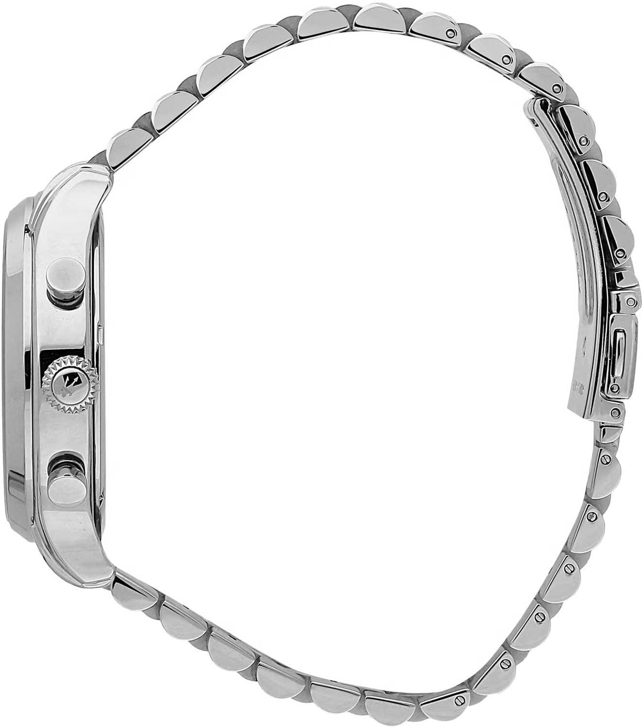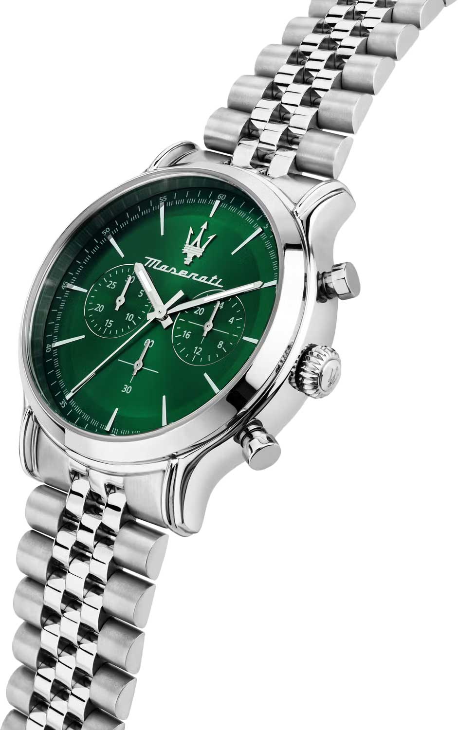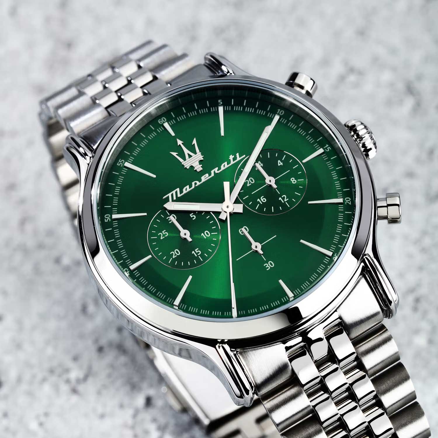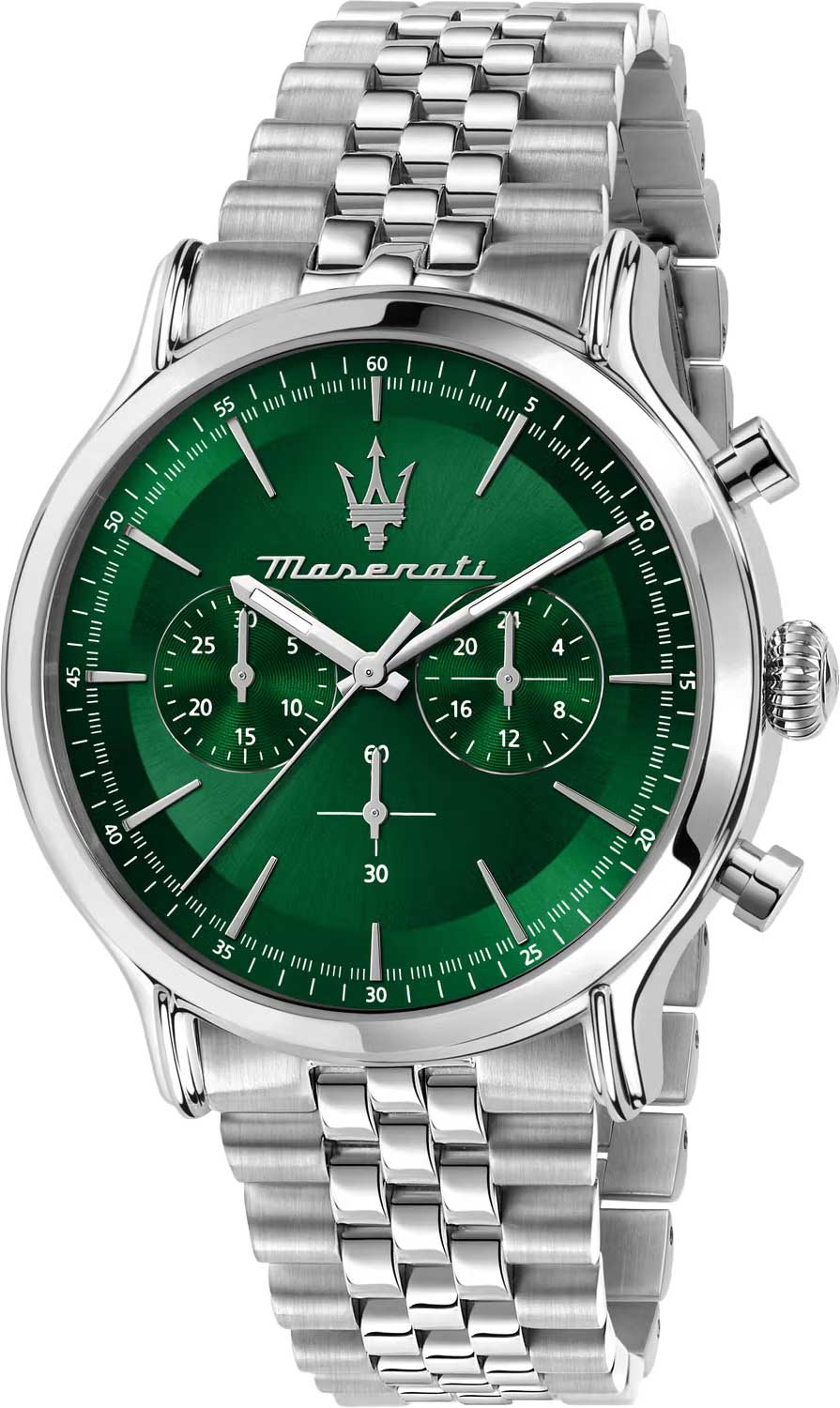 Часы-хронограф с секундомером оснащены 12-часовым и 24-часовым форматами времени. Циферблат изготовлен по технологии Sunray (солнечные лучи) и украшен логотипом бренда «Maserati». Часовые метки выполнены в виде штрихов. Задняя крышка и заводная головка завинчиваются. Браслет снабжён раскладывающейся застёжкой.