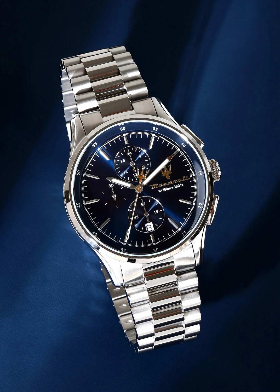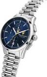 Хронограф с секундомером. Доступен 12-часовой и 24-часовой формат времени. Корпус из стали круглой формы. Циферблат изготовлен по технологии Sunray (солнечные лучи) и украшен логотипом бренда Maserati.