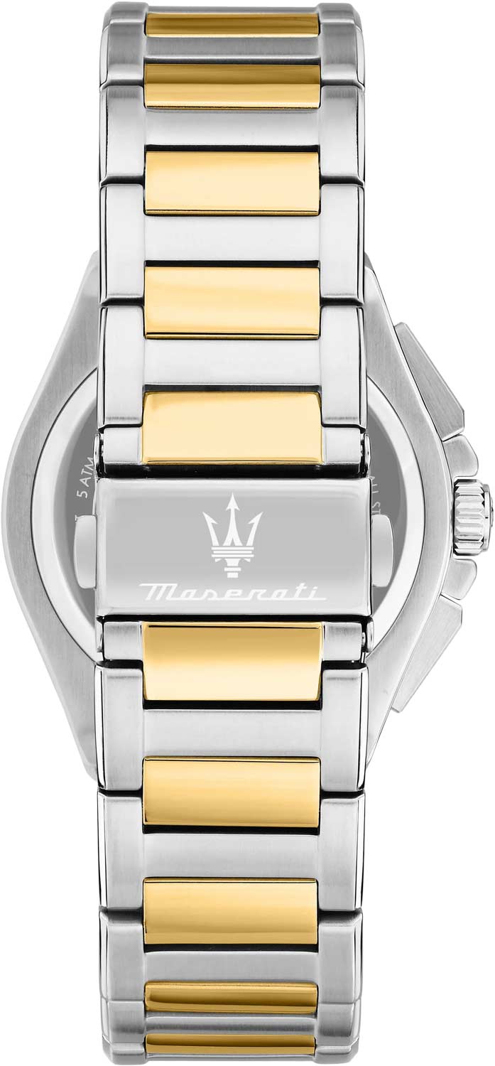 Часовые метки выполнены в виде штрихов. Индикатор даты расположен на отметке 4 часа. Заводная головка рифленая и защищена. Браслет оснащен раскладывающейся застежкой.