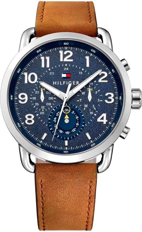 Наручные часы Tommy Hilfiger — это стильный и качественный аксессуар, который подчеркнёт уверенность и вкус мужчины. Корпус выполнен из стали и имеет круглую форму. Циферблат защищён прочным минеральным стеклом. На нём расположены метки в виде штрихов и арабская цифра 12. Указатели для отображения даты и дня недели вынесены на отдельные мини-циферблаты. Заводная головка имеет рифлёную поверхность и дополнительную защиту. Браслет изготовлен из стали и оснащён раскладывающейся застёжкой.