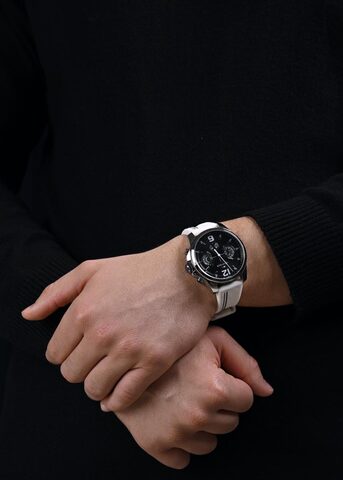 В 24-часовом формате, а также отдельно отображаются дата и день недели. Заводная головка рифленая и снабжена защитой. Задняя крышка завинчивается. Ремешок из силикона оснащен классической застежкой.