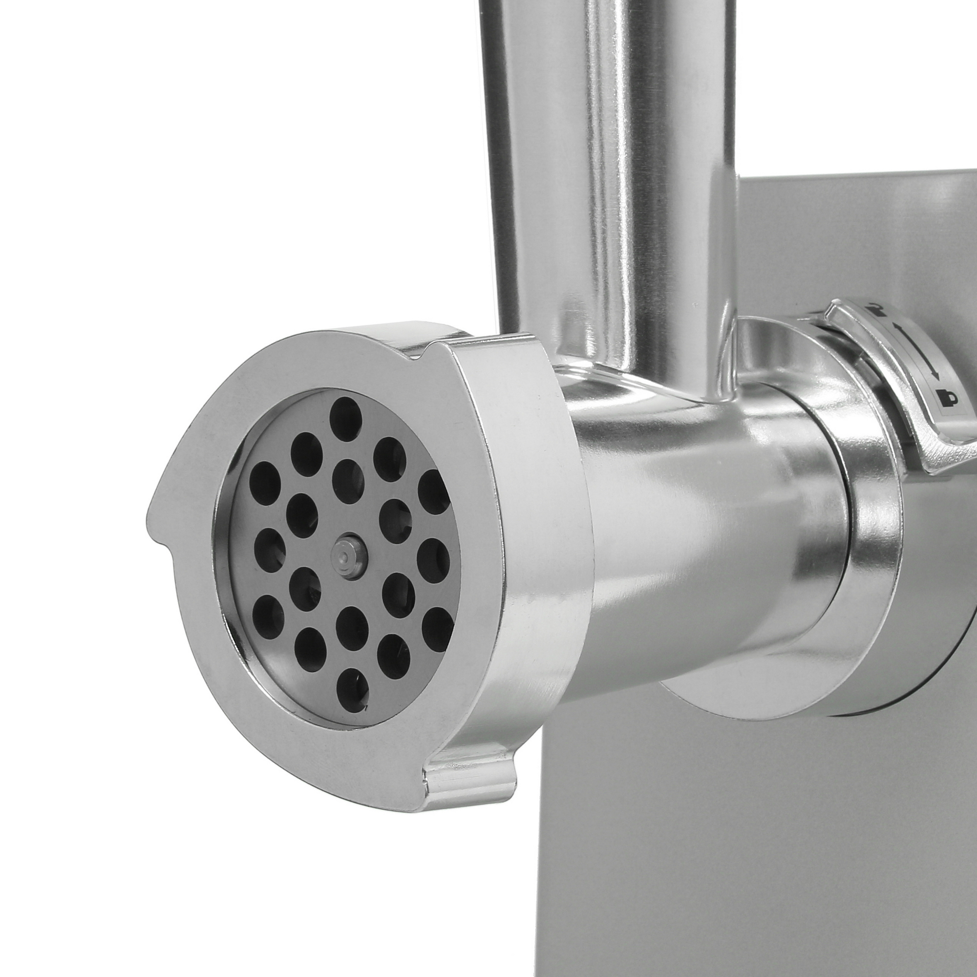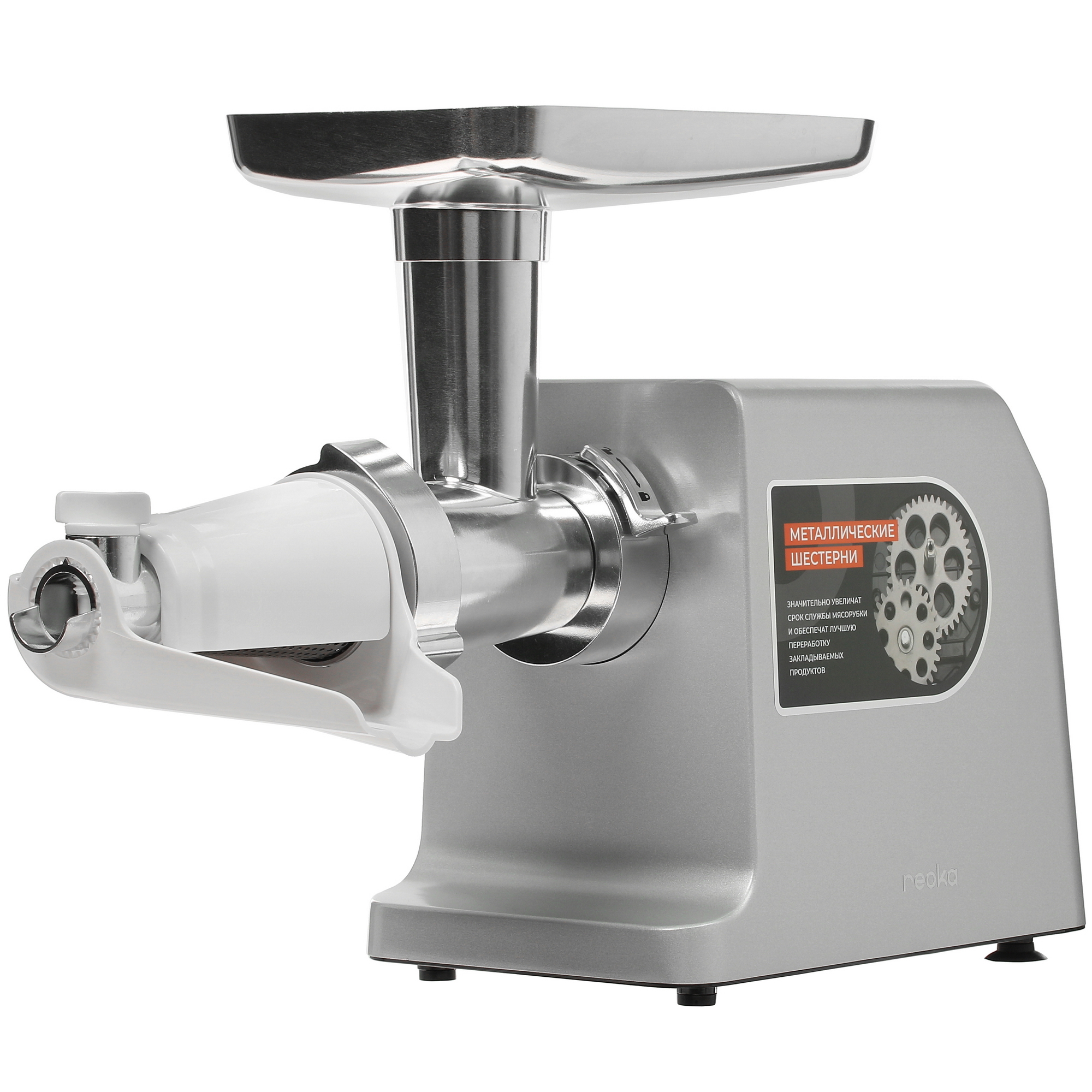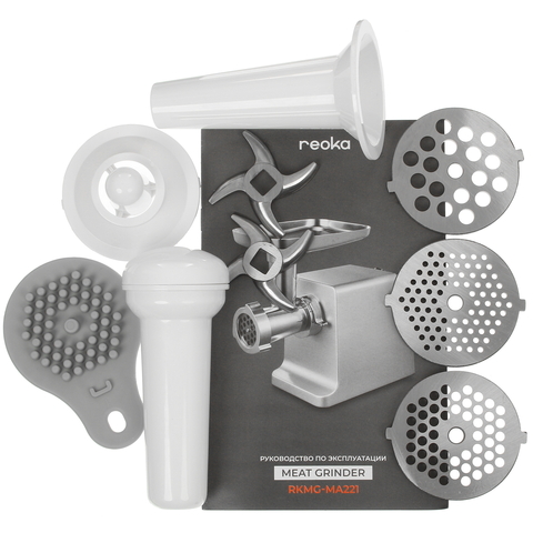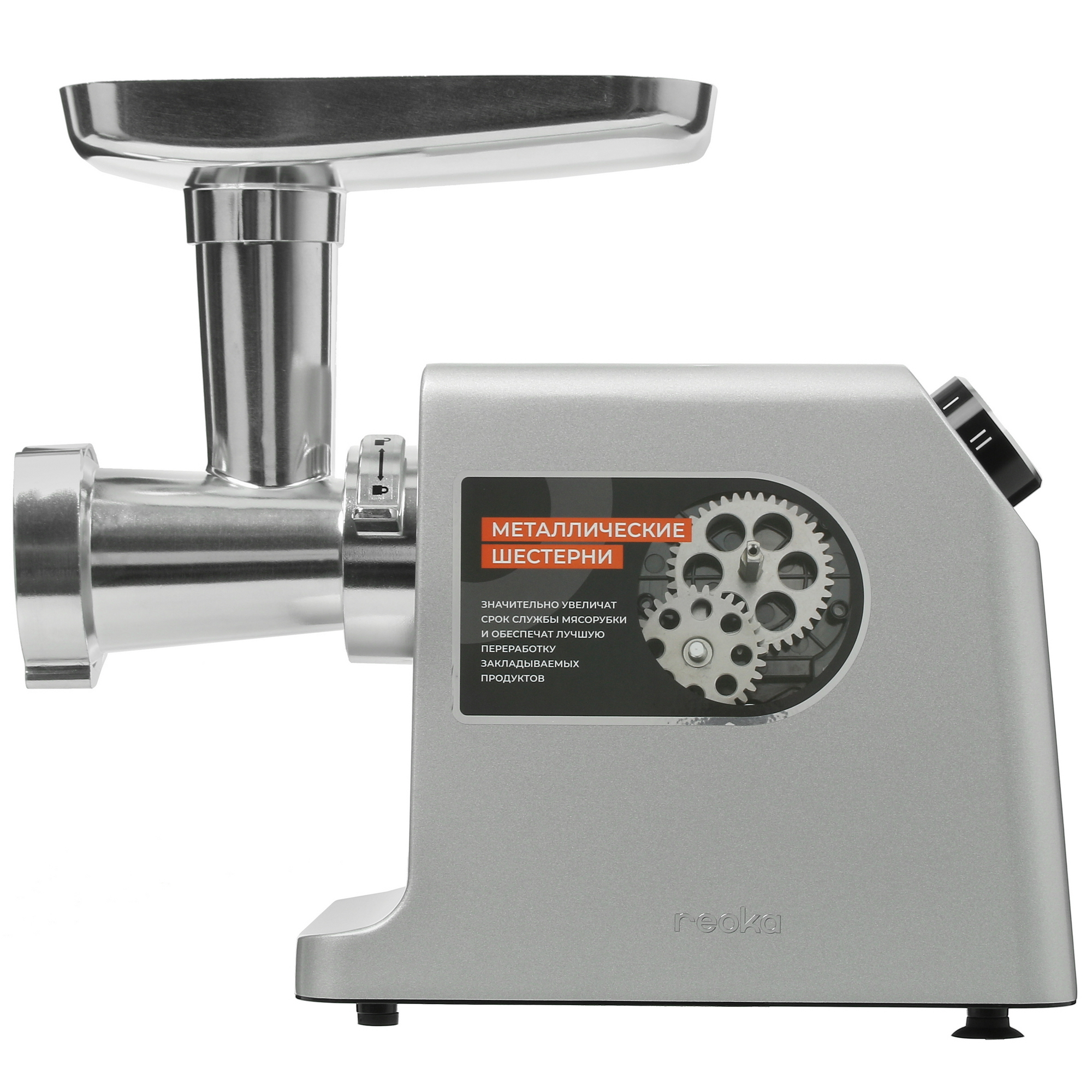 Мясорубка электрическая Reoka RKMG-MA221 мощностью 2200 Вт оснащена системой реверса. Она поможет устранить застрявшие куски продуктов. Лоток выполнен из металла – материала, который не окисляется и не впитывает запахи. Комплект различных насадок позволит приготовить фарш, колбасы и кеббе, а также нарезать овощи и сделать витаминный сок. Мясорубка электрическая Reoka RKMG-MA221 обладает антискользящим основанием, которое устойчиво фиксирует ее на любой поверхности. Выбор подходящей среди 2 скоростей производится через механический переключатель. Конструкцией металлического корпуса предусмотрен отсек для размещения насадок. Защитная система не допустит поломки прибора из-за перегрева или перегрузки двигателя.
