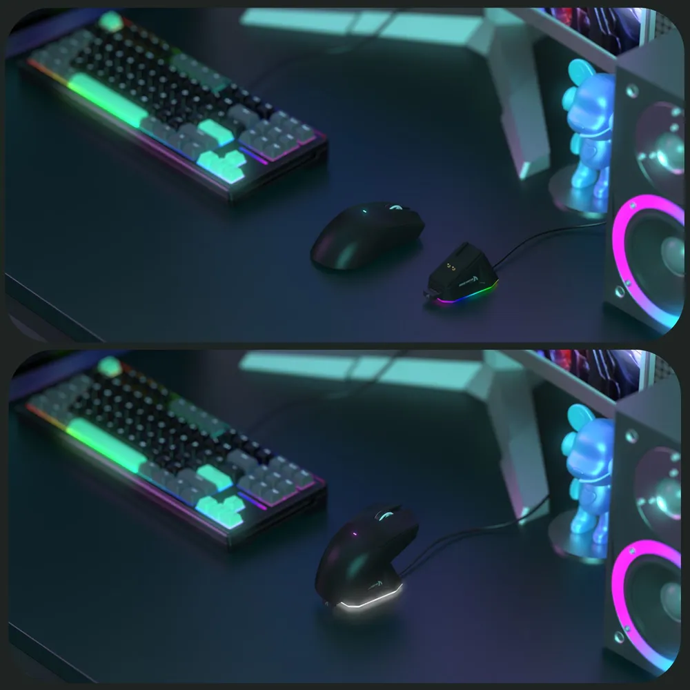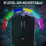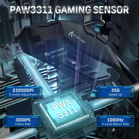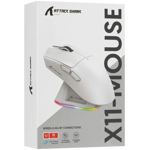 Игровая мышь Attack Shark X11 PAW3311 с док-станцией оснащена флагманским сенсором PixArt 3311 с разрешением до 22 000 DPI и 6 уровнями регулировки. Магнитная зарядная док-станция имеет сенсорный переключатель, который позволяет менять эффект подсветки. Есть три различных режима подключения: проводной USB Type-C, Bluetooth, а также 2.4G, которые меняются с помощью кнопки на задней панели мыши. Встроенный аккумулятор работает до 65 часов непрерывного использования.