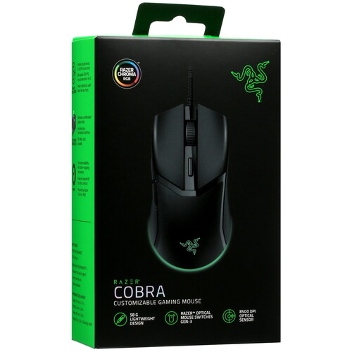 Razer Cobra [RZ01-04650100-R3M1] имеет встроенную память, что позволяет сохранять настройки независимо от подключённого устройства. Корпус из матового пластика не собирает пыль и устойчив к загрязнениям. Эргономичная форма подходит для правой и левой руки. RGB-подсветка выделяет мышь среди других периферийных устройств.
