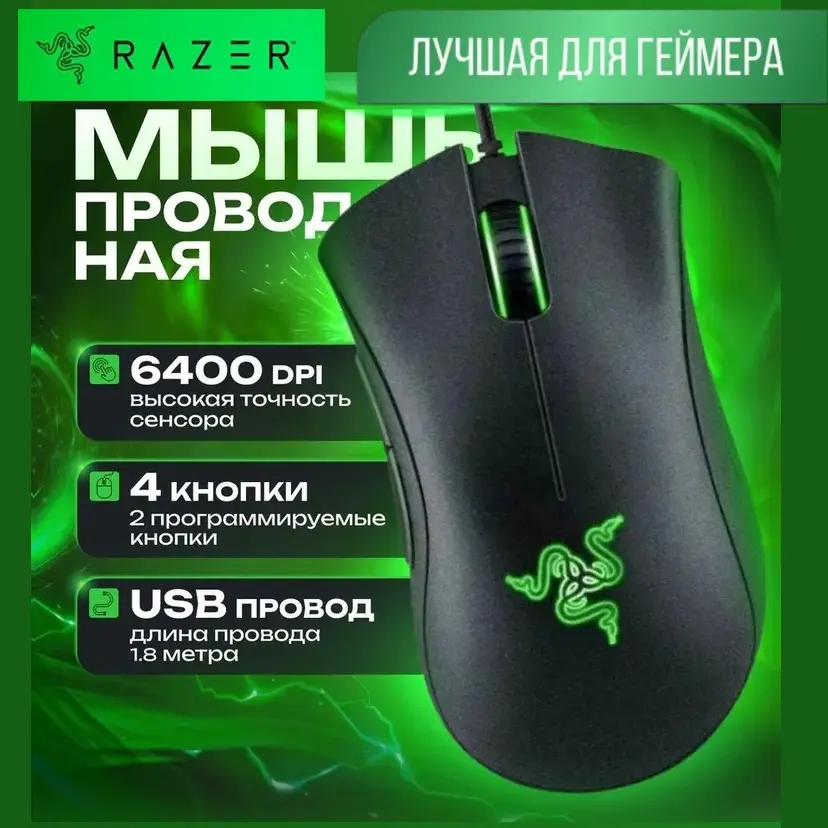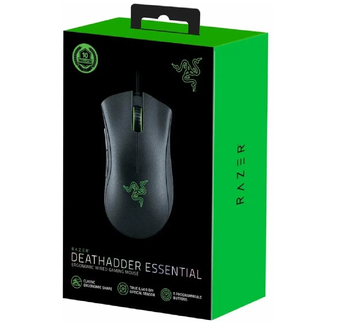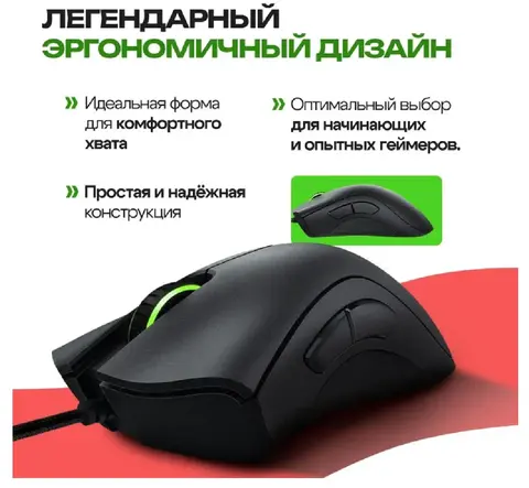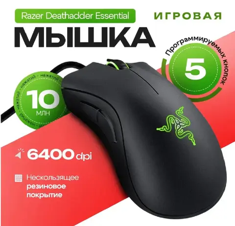Мышь проводная Razer DeathAdder Essential облачена в черный корпус эргономичной формы для комфортного хвата правой рукой. В конструкции модели присутствуют пять независимых программируемых кнопок с мгновенным откликом для полного контроля над игровой ситуацией. Механические переключатели обеспечивают до 10 миллионов кликов для продолжительного срока службы манипулятора. Оптический светодиодный сенсор с максимальным разрешением 6400 dpi гарантирует точное позиционирование курсора на экране и его моментальное перемещение вслед за движением мыши Razer DeathAdder Essential по поверхности.