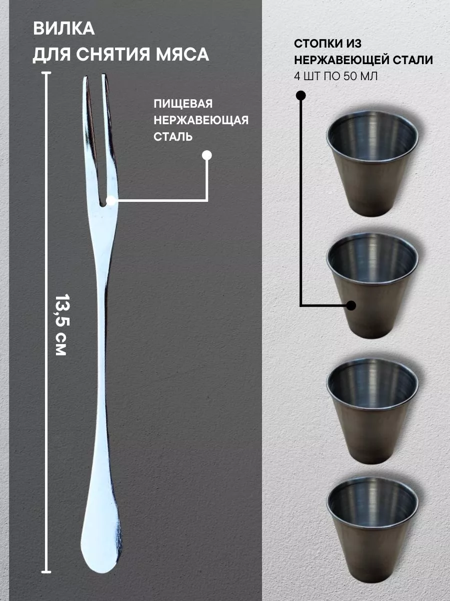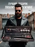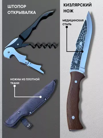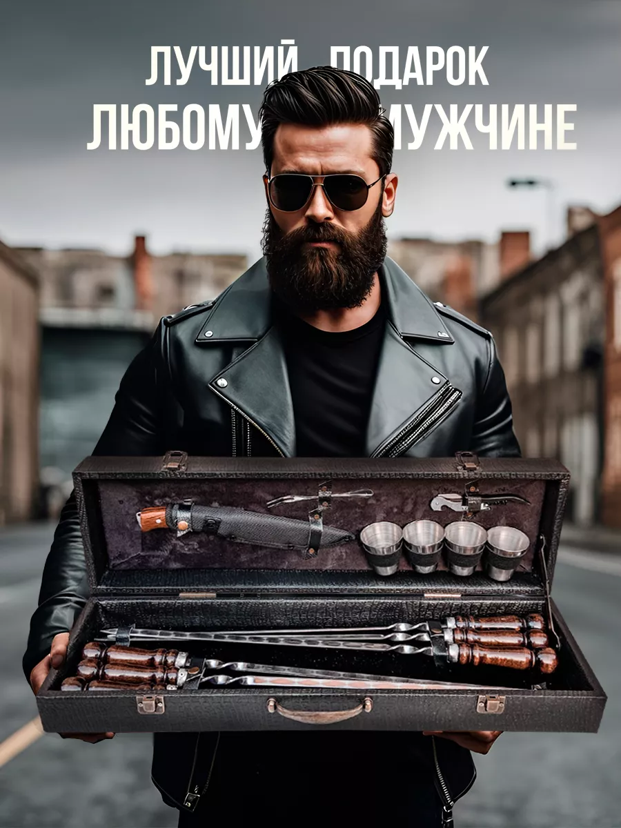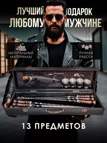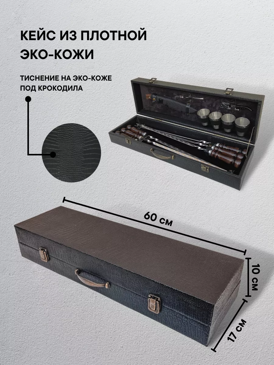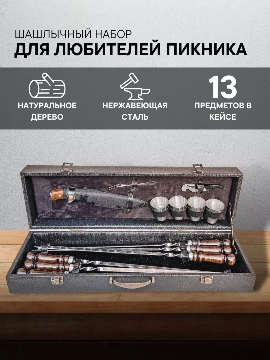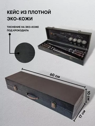 шампура с деревянной ручкой 6 шт.; нож кизляр с чехлом; штопор открывашка; вилка для мяса; стопки набор 4 шт.; кейс для хранения всего набора; подарочный набор мужчине