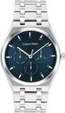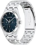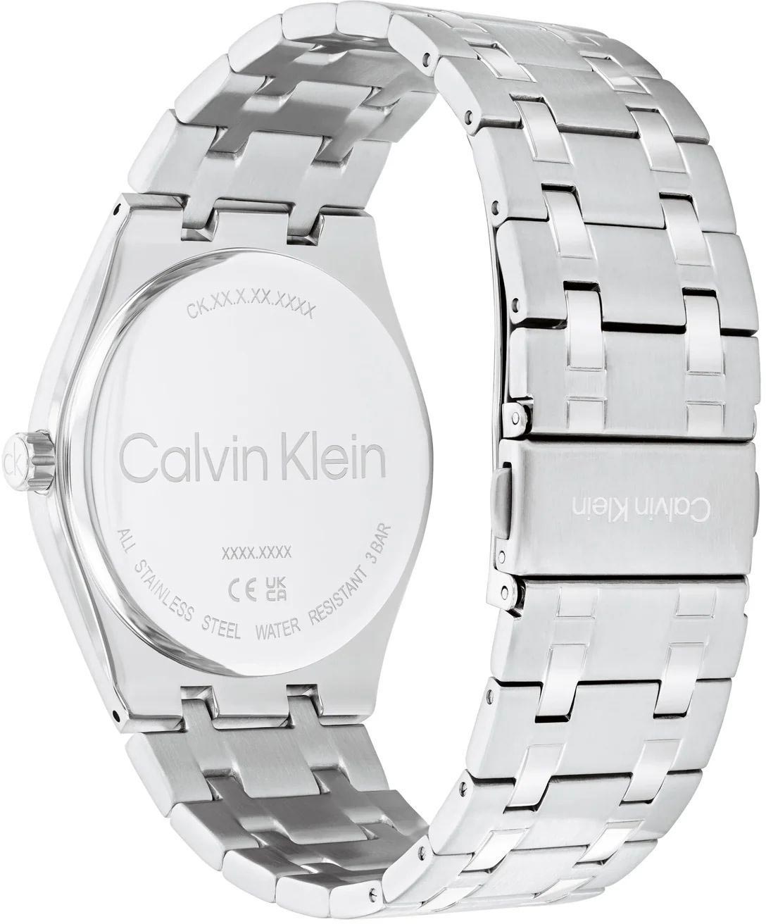 Мужские кварцевые часы с функционалом. Корпус из стали круглой формы с матовой и полированной отделкой. Циферблат украшен узором из тонких горизонтальных линий по технологии Sunray (солнечные лучи) и фирменным логотипом Calvin Klein.