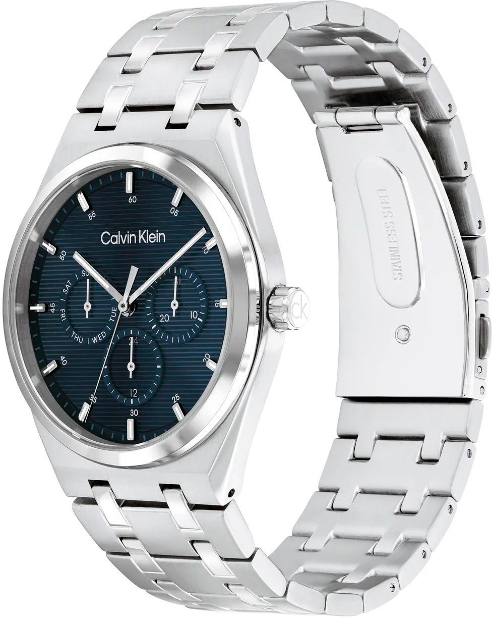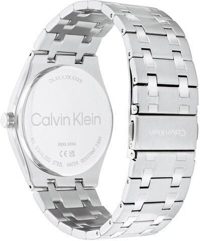 Дата и день недели отображаются на отдельных циферблатах. Доступны 12-часовой и 24-часовой форматы времени. Рифленая заводная головка украшена логотипом CK. Браслет из стали с матовой и полированной отделкой надежно фиксирует часы на запястье.