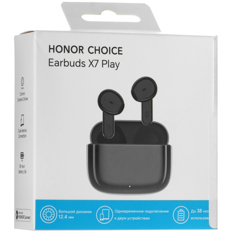 HONOR CHOICE Earbuds X7 Play — это лёгкие и компактные наушники-вкладыши. Они оснащены функцией шумоподавления, которая повышает качество разговоров даже в шумной среде. Одного заряда встроенных аккумуляторов хватает на воспроизведение музыки более 6,5 часов. Если подзарядить наушники с помощью кейса, общее время работы увеличится до 38 часов, что даёт возможность слушать музыку дольше.
