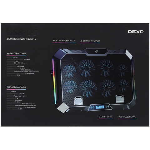 Подставка для ноутбука DEXP Gaming Series GS8-06 предназначена для использования с ноутбуками с диагональю экрана до 15.6 дюймов. Устройство оснащено восемью вентиляторами, RGB-подсветкой и двумя портами USB. Регулируемая по высоте подставка изготовлена из металла и пластика.