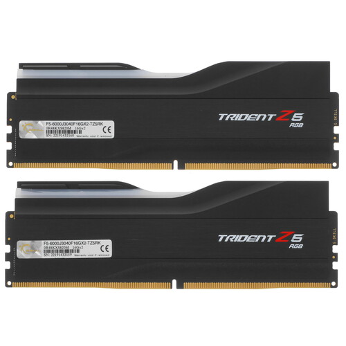 Комплект оперативной памяти G.Skill Trident Z5 RGB состоит из двух модулей общим объёмом 32 ГБ. Этот набор станет эффектным, производительным и надёжным дополнением для современного игрового ПК. Модули соответствуют стандарту DDR5 и работают на частоте 6000 МГц. Память совместима с платформами Intel и поддерживает разгон через технологию Intel XMP 3.0. Для эффективного отвода тепла и обеспечения стабильной работы при высоких нагрузках модули G.Skill Trident Z5 RGB оснащены алюминиевыми радиаторами с уникальной конструкцией и программируемой RGB-подсветкой.