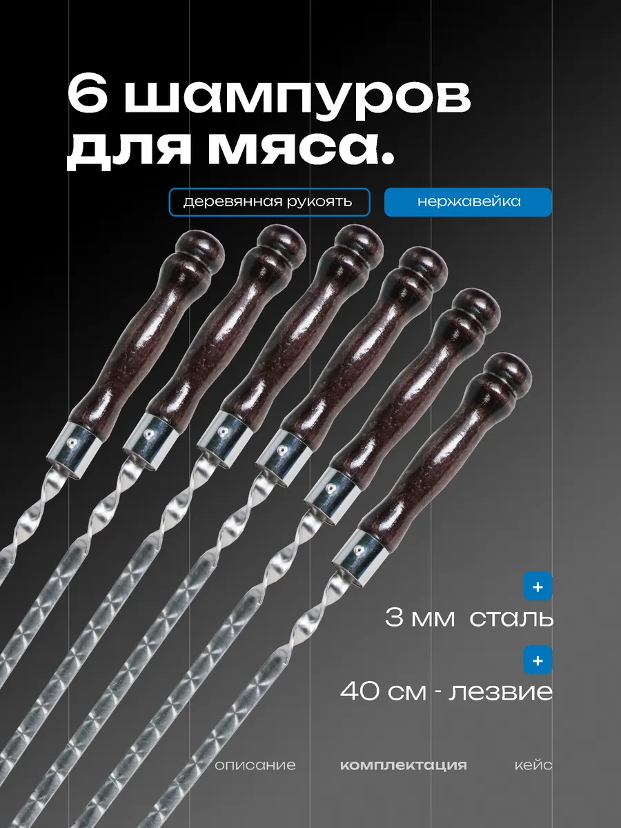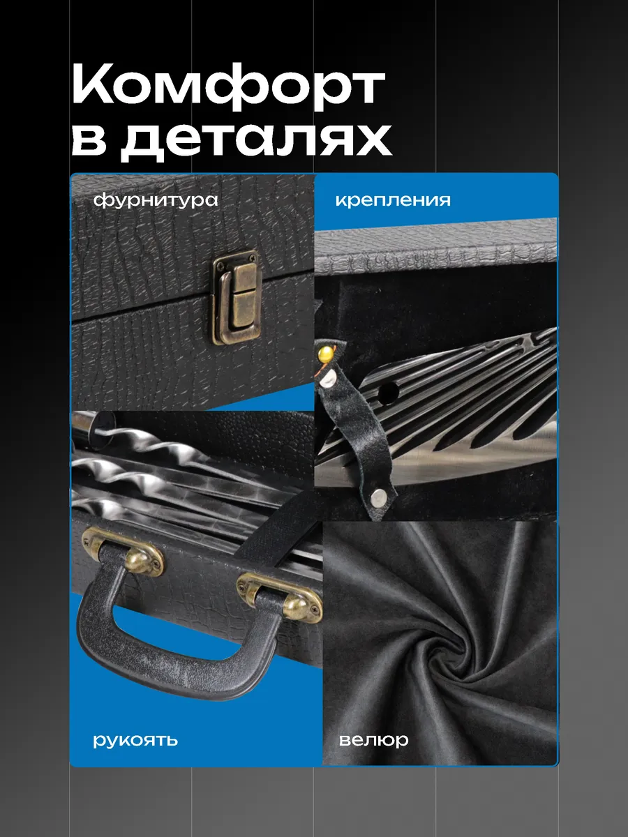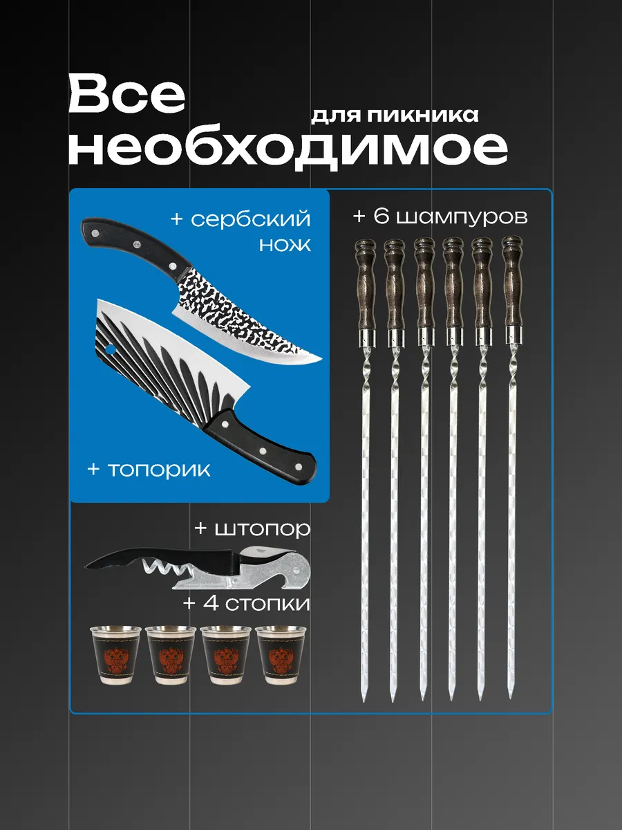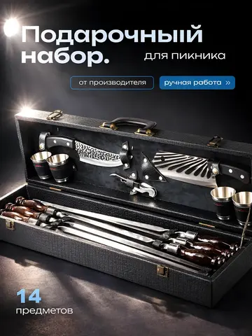 Подарочный шашлычный набор в кейсе — идеальное сочетание стиля и практичности. Создан специально для тех, кто любит готовить вкуснейшие шашлыки на свежем воздухе. Все предметы набора обладают продуманным до мелочей дизайном, где каждый элемент выполняет свою функцию. Материалы высочайшего качества гарантируют долгий срок службы. Особое внимание заслуживают шампуры длиной 60 см, выполненные из безопасной нержавеющей стали. Их оптимальные размеры позволяют легко переворачивать мясо во время готовки. Ручки из резного дерева дополняются огнеупорными кольцами. Сердце любого настоящего мужчины затрепещет от вида кинжала «Кизляр», сделанного вручную мастерами Северного Кавказа. Его лезвие изготовлено из закалённой стали и долгое время сохраняет остроту. Рукоятка из древесины очень удобно ложится в руку. Топорик разделочного типа также входит в комплект. Изделие сделано из качественных материалов и упаковано в кожаный чехол.