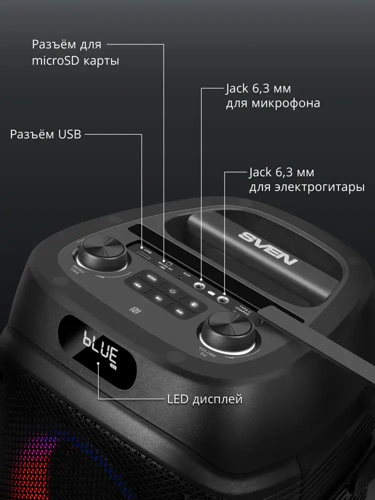 Модель SVEN PS-850 — это портативная акустическая система мощностью 100 Вт с удобным управлением и поддержкой технологий RGB-подсветки и True Wireless Stereo. Прочный корпус и эргономичная ручка позволяют брать её куда угодно. При весе около 6 кг модель обладает функциональностью полноценных стационарных систем благодаря поддержке приложений и возможности подключения инструментов. Наличие дисплея и микрофона делают эту акустическую систему подходящей как для домашних развлечений, так и профессиональных выступлений.
