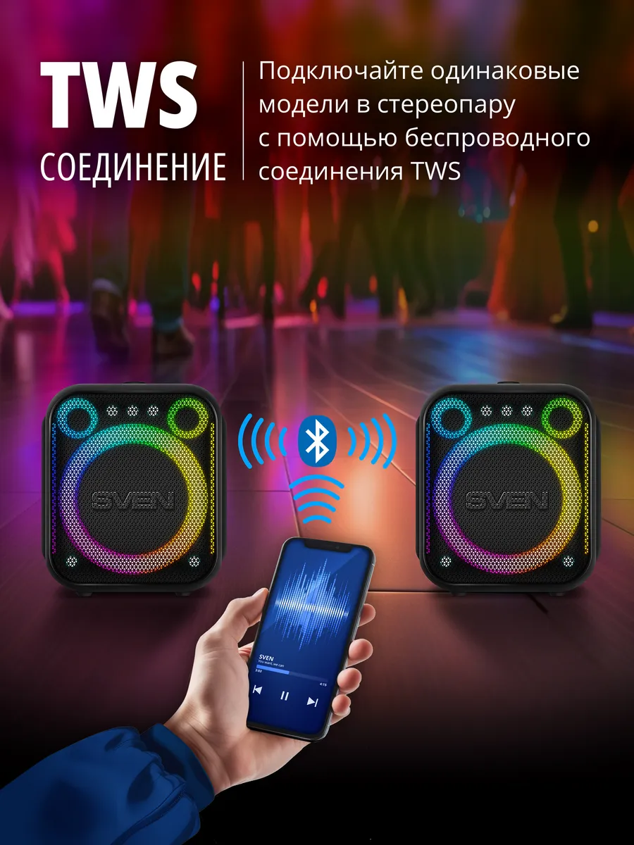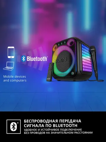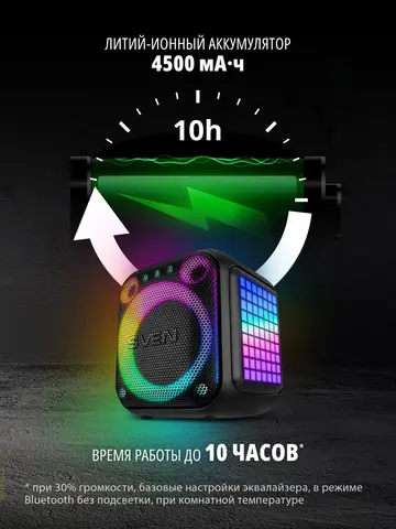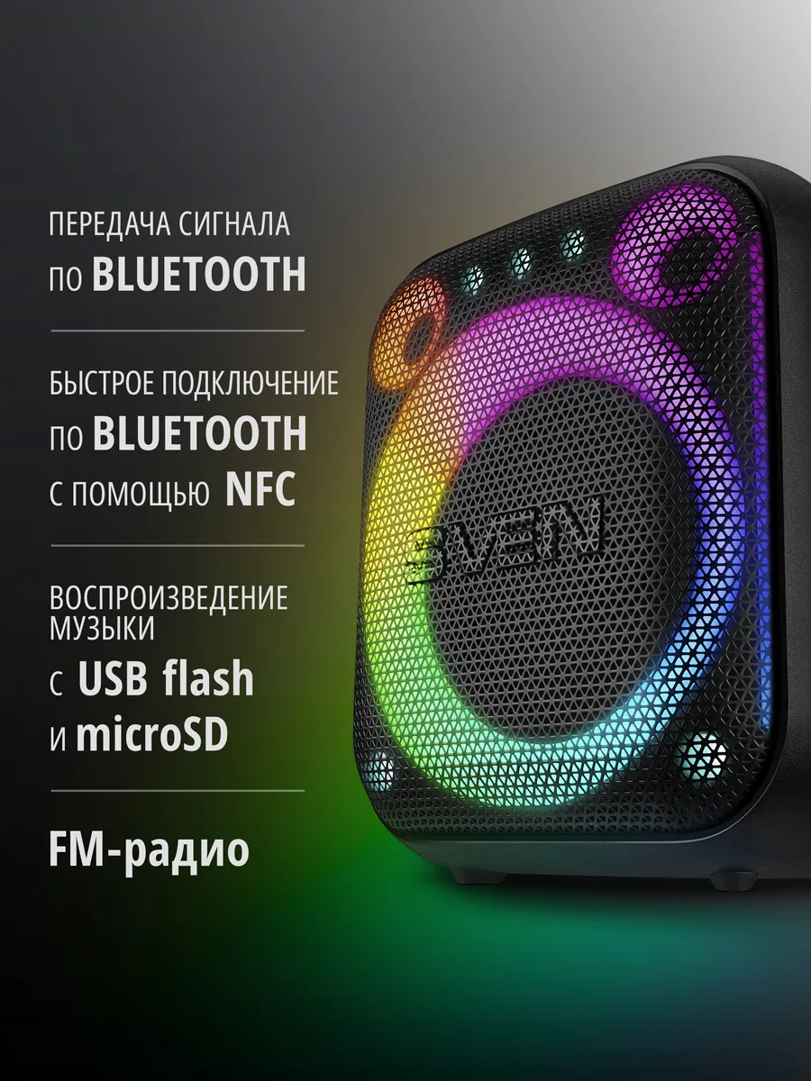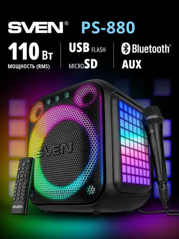 Представляем портативную колонку SVEN PS-880 — уникальное сочетание инновационного дизайна и впечатляющего звучания! Кубический корпус с мягкими линиями и яркая RGB-подсветка сразу привлекают взгляд. Мощность 110 Вт, длительное автономное время работы до 10 часов и поддержка технологий Bluetooth, NFC делают её идеальной спутницей любого мероприятия. Дополнительные плюсы — совместимость с двумя микрофонами для караоке и интеграция через TWS в стереопаре. Ощутите максимальное удовольствие от музыки вместе с PS-880!