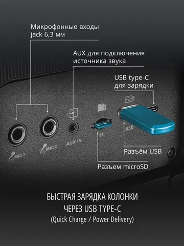 Раскройте свои таланты исполнителя, подключив к колонке микрофон, входящий в комплект. Настройте желаемую громкость звучания голоса на панели управления. Порадуйте близких живым звучанием любимых мелодий!