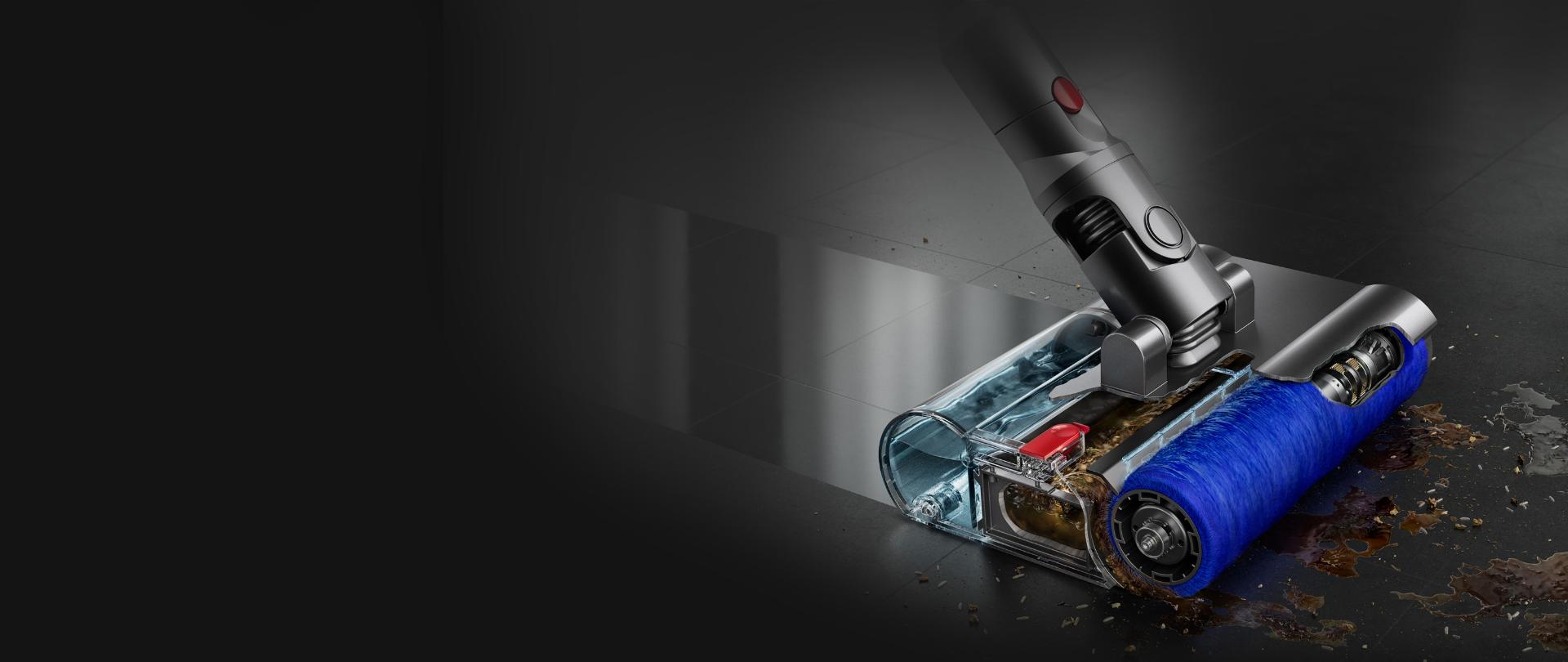 Моторизованный валик для влажной уборки собирает жидкости, мусор и стойкие пятна, которые непрерывно удаляются из валика при каждом вращении.