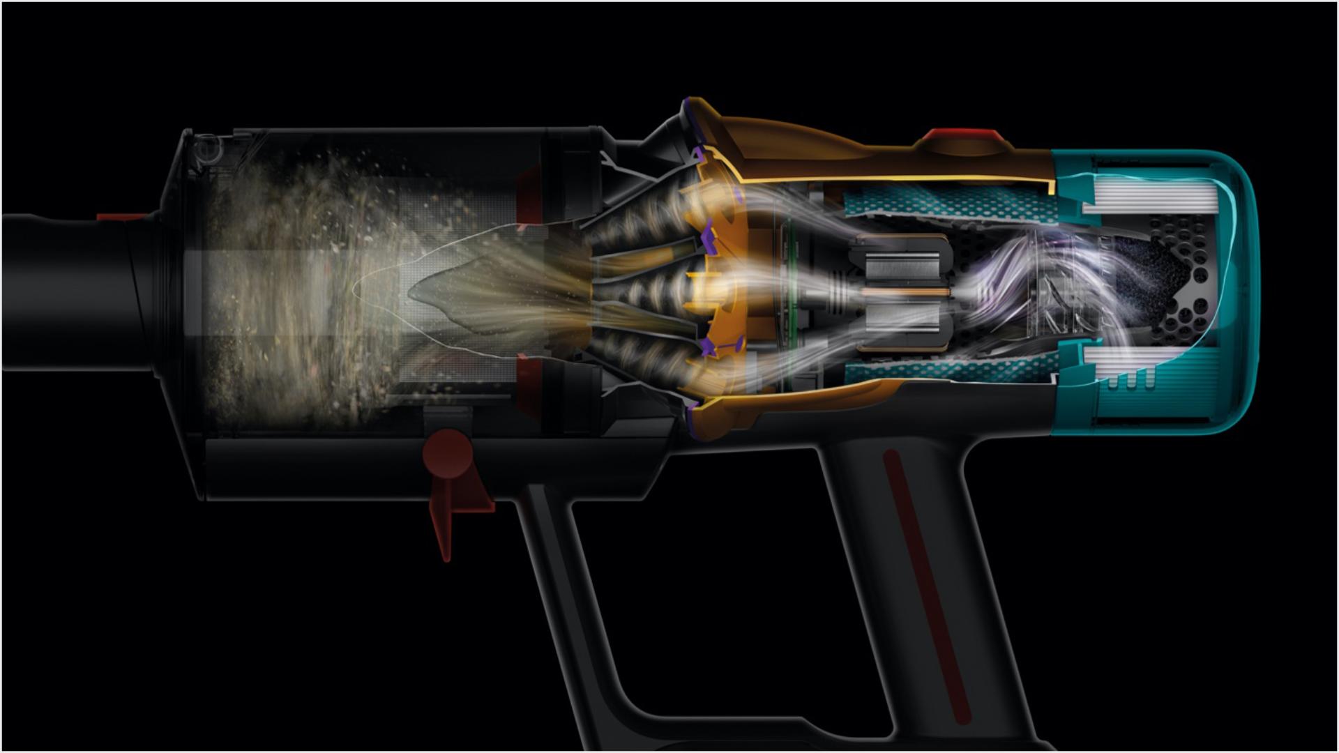 Двигатель Dyson Hyperdymium™ вращается со скоростью до 125 000 об/мин, обеспечивая мощное всасывание и глубокую очистку.