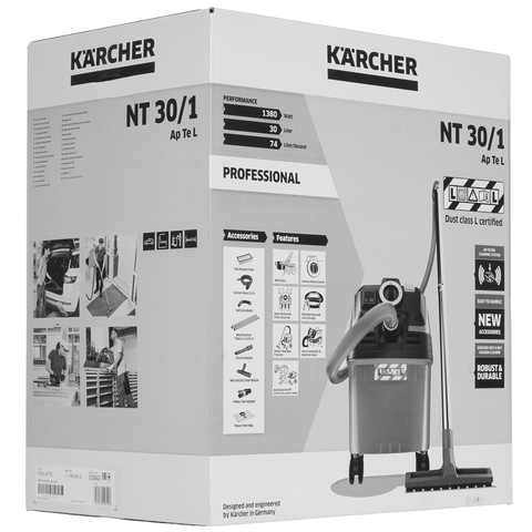 Пылесос Karcher NT 30/1 Ap Te L оснащен автоматической штепсельной розеткой, что позволяет использовать его вместе с электроинструментами. Это профессиональное устройство эффективно удаляет пыль, мусор и жидкости в мастерских и после ремонтных работ. Полуавтоматическая система очистки мешка объемом 30 литров оперативно удаляет загрязнения и поддерживает высокую мощность всасывания.
