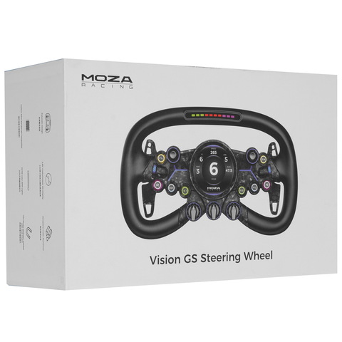 Moza Vision GS — это рулевое колесо с системой быстрой установки, совместимой со всеми основаниями MOZA. Колесо изготовлено из высококачественных материалов: его каркас выполнен из аэрокосмического алюминиевого сплава, рукоятки — из микрофибры, а лицевая панель — из углеродного композита. Кованые магнитные переключатели под рулём работают на базе технологии датчиков Холла, обеспечивая точность отслеживания до 0.03 мм. Кнопки на руле имеют RGB-подсветку с коротким ходом. Всего доступно 72 программируемых элемента управления, среди которых 7-позиционный переключатель, универсальный джойстик, поворотные сенсоры и датчики для большого пальца.