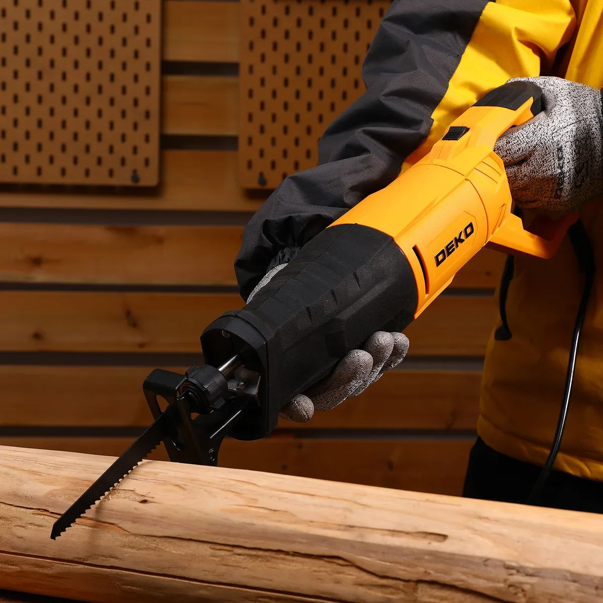 DEKO DKRS1350EСабельная пила DEKO DKRS1350E представляет собой надежный инструмент для решения широкого спектра задач по дому и на приусадебном участке. Оснащённая мощным щеточным двигателем на 1350 Вт, она демонстрирует стабильную производительность и уверенно справляется с резом как древесины, так и металла. Работает от сети с напряжением 230–240 В и частотой 50 Гц, что делает её совместимой с большинством бытовых электросетей.