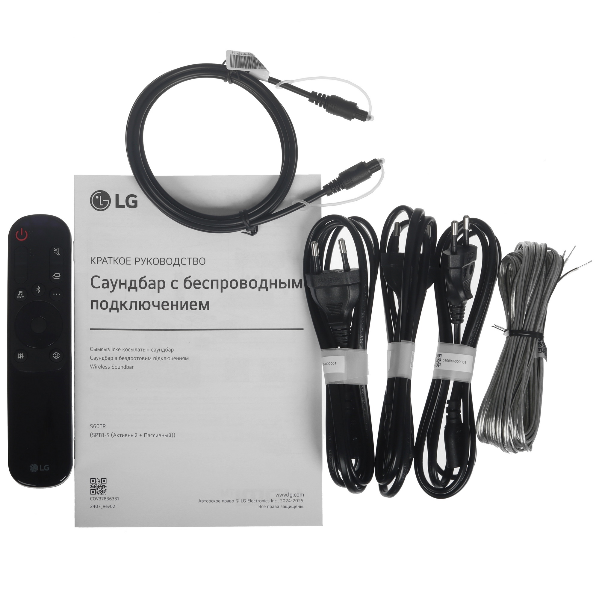 динамик х2 шт., документация, кабель ODT Toslink - ODT Toslink, кабель питания х2 шт., кронштейн, пульт ДУ