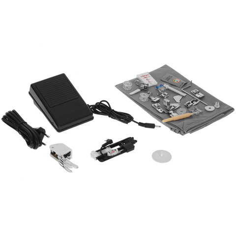 вспарыватель-кисточка, двойная игла, держатель для катушки, документация, дополнительный катушечный стержень, иглы, фетровая прокладка, шпульки