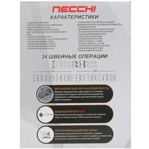 Necchi Q132A – швейное мастерство становится проще! Горизонтальный челнок облегчает заправку нити (до 1000 стежков в минуту), а регулируемый рычаг контролирует скорость работы. Дополнительный стол расширяет рабочее пространство, подсветка помогает работать с мелкими деталями, рукавная платформа удобна для сложных зон. Подходит для быстрой вставки молний и пуговиц!