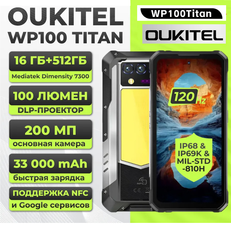 Смартфон OUKITEL WP100 TITAN 5G — мощь и защита для настоящих экстремалов! 33.000 mAh батареи обеспечивают бесконечное использование, а класс защиты IP68/IP69K оберегают от воды и пыли. Яркий IPS-экран FHD+120 Гц идеален для игр (PUBG, "Мир танков" и других), а проектor 100 люмен превращает каждую ночь в киносеанс. Камеры на 200 МП днем и 20 МП ночью делают фото великолепными. Мощный чипсет Mediatek Dimensity 7300 и 16 ГБ оперативной памяти гарантируют молниеносную работу. Приятный подарок вашим близким!